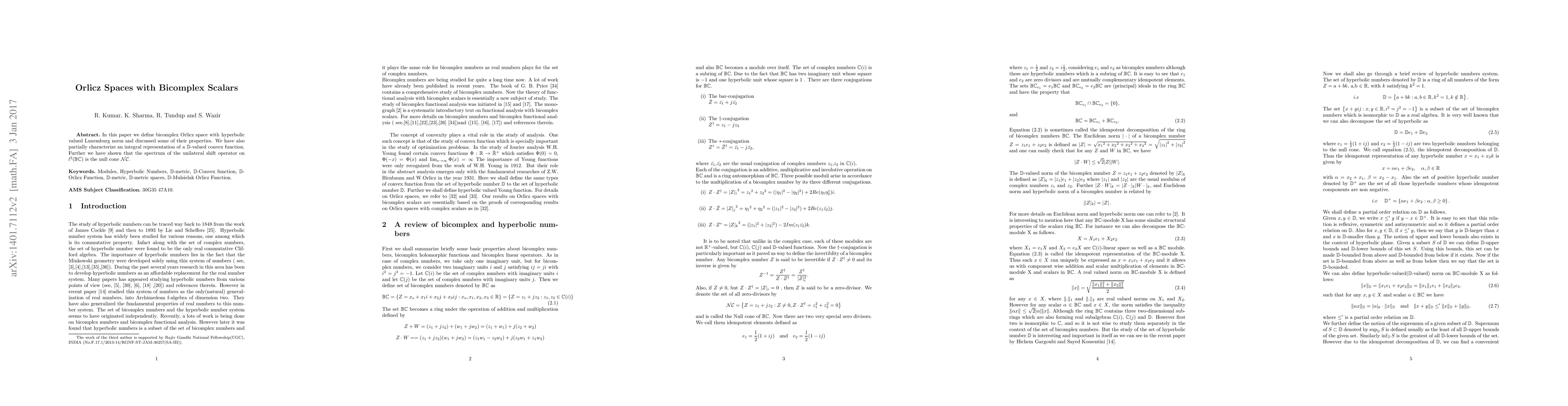 In this paper we define bicomplex Orlicz space with hyperbolic valued Luxemburg norm and discussed some of their properties. We have also partially characterize an integral representation of a $\mathbb{D}$-valued convex function. Further we have shown that the spectrum of the unilateral shift operator on $l^2(\mathbb{BC})$ is the null cone $\mathcal{NC}$.