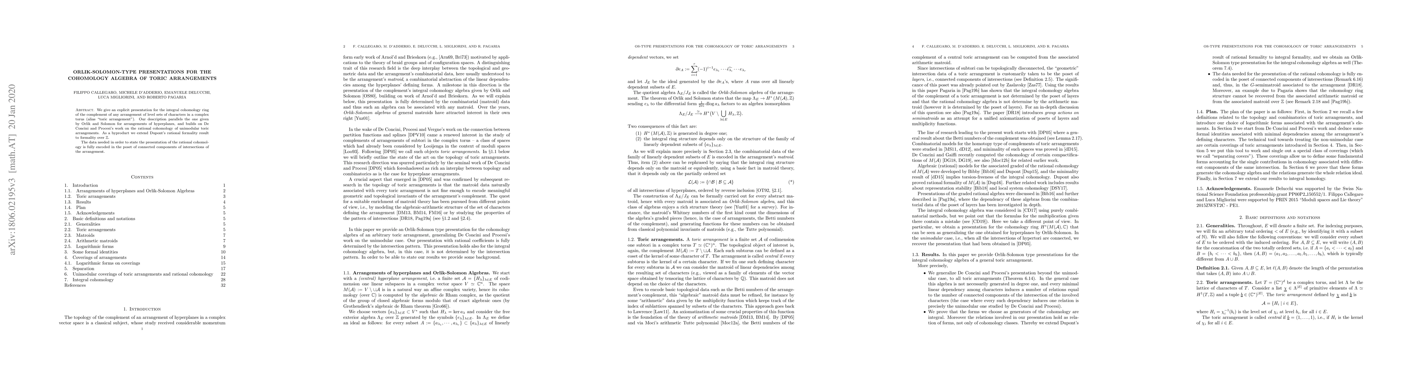 We give an explicit presentation for the integral cohomology ring of the complement of any arrangement of level sets of characters in a complex torus (alias "toric arrangement"). Our description parallels the one given by Orlik and Solomon for arrangements of hyperplanes, and builds on De Concini and Procesi's work on the rational cohomology of unimodular toric arrangements. As a byproduct we extend Dupont's rational formality result to formality over $\mathbb Z$. The data needed in order to state the presentation is fully encoded in the poset of connected components of intersections of the arrangement.