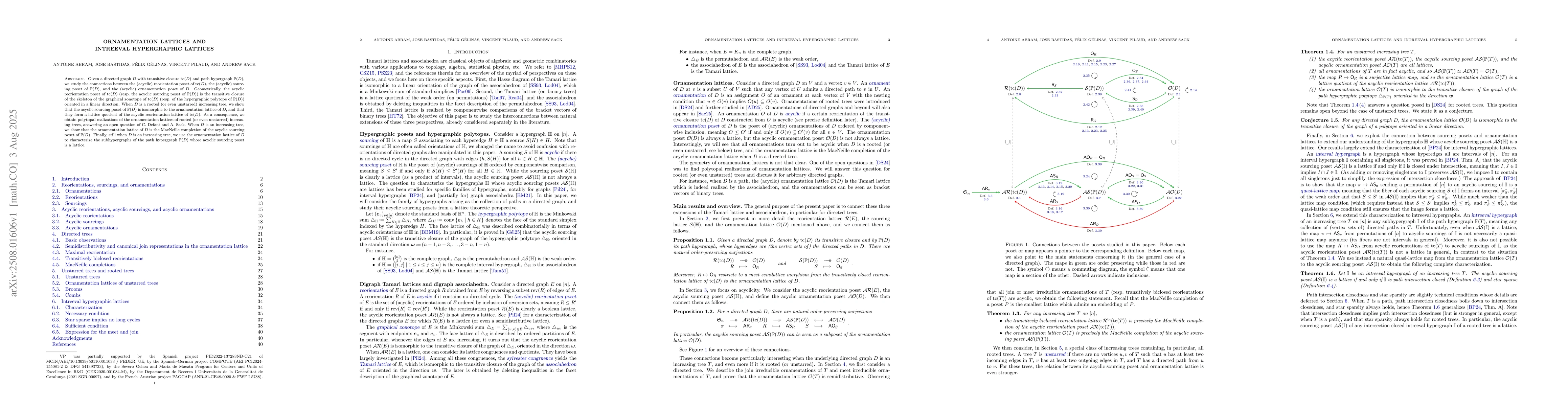 Given a directed graph $D$ with transitive closure $\operatorname{tc}(D)$ and path hypergraph $\mathbb{P}(D)$, we study the connections between the (acyclic) reorientation poset of $\operatorname{tc}(D)$, the (acyclic) sourcing poset of $\mathbb{P}(D)$, and the (acyclic) ornamentation poset of $D$. Geometrically, the acyclic reorientation poset of $\operatorname{tc}(D)$ (resp. the acyclic sourcing poset of $\mathbb{P}(D)$) is the transitive closure of the skeleton of the graphical zonotope of $\operatorname{tc}(D)$ (resp. of the hypergraphic polytope of $\mathbb{P}(D)$) oriented in a linear direction. When $D$ is a rooted (or even unstarred) increasing tree, we show that the acyclic sourcing poset of $\mathbb{P}(D)$ is isomorphic to the ornamentation lattice of $D$, and that they form a lattice quotient of the acyclic reorientation lattice of $\operatorname{tc}(D)$. As a consequence, we obtain polytopal realizations of the ornamentation lattices of rooted (or even unstarred) increasing trees, answering an open question of C. Defant and A. Sack. When $D$ is an increasing tree, we show that the ornamentation lattice of $D$ is the MacNeille completion of the acyclic sourcing poset of $\mathbb{P}(D)$. Finally, still when $D$ is an increasing tree, we use the ornamentation lattice of $D$ to characterize the subhypergraphs of the path hypergraph $\mathbb{P}(D)$ whose acyclic sourcing poset is a lattice.