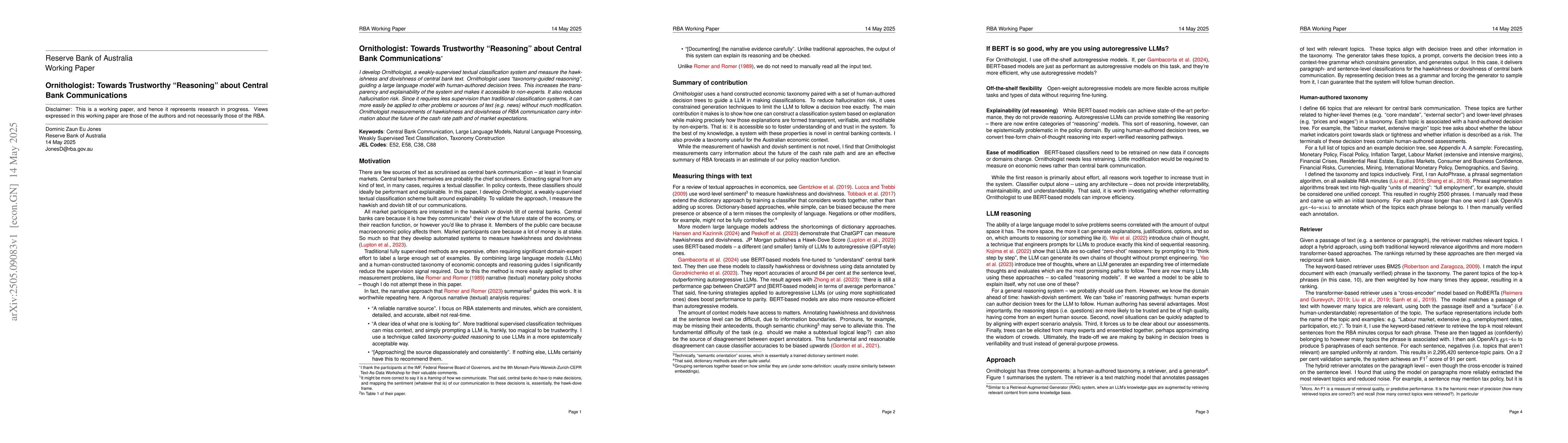 I develop Ornithologist, a weakly-supervised textual classification system and measure the hawkishness and dovishness of central bank text. Ornithologist uses ``taxonomy-guided reasoning'', guiding a large language model with human-authored decision trees. This increases the transparency and explainability of the system and makes it accessible to non-experts. It also reduces hallucination risk. Since it requires less supervision than traditional classification systems, it can more easily be applied to other problems or sources of text (e.g. news) without much modification. Ornithologist measurements of hawkishness and dovishness of RBA communication carry information about the future of the cash rate path and of market expectations.