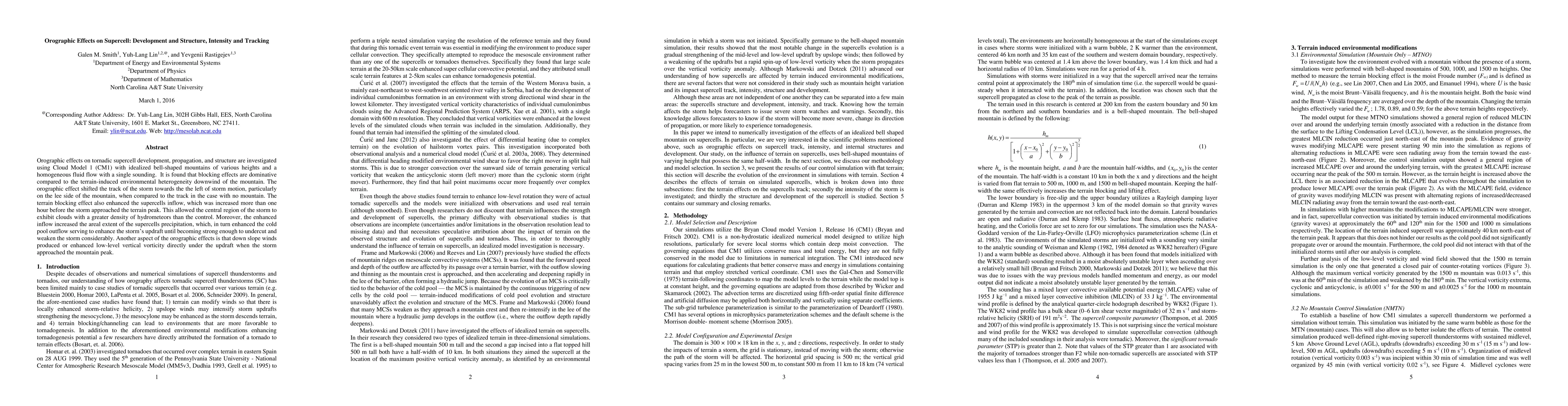 Terrain effects on thunderstorms, which are conducive to tornado formation, are investigated.