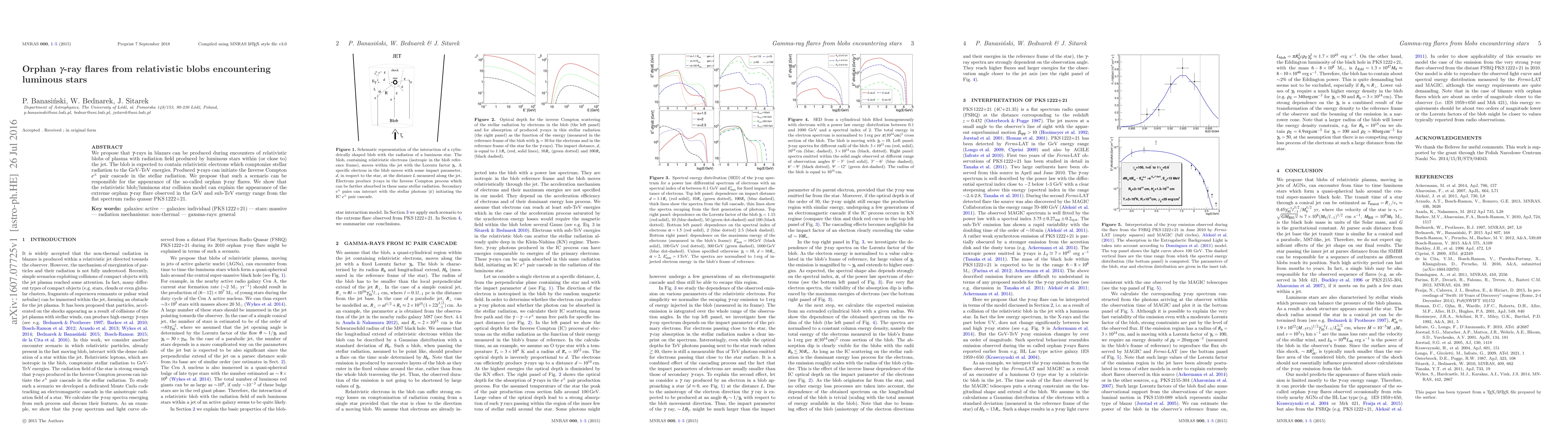 We propose that {\gamma} -rays in blazars can be produced during encounters of relativistic blobs of plasma with radiation field produced by luminous stars within (or close to) the jet. The blob is expected to contain relativistic electrons which comptonize stellar radiation to the GeV-TeV energies. Produced {\gamma} -rays can initiate the Inverse Compton e+/- pair cascade in the stellar radiation. We propose that such a scenario can be responsible for the appearance of the so-called orphan {\gamma} -ray flares. We show that the relativistic blob/luminous star collision model can explain the appearance of the extreme orphan {\gamma} -ray flare observed in the GeV and sub-TeV energy range from the flat spectrum radio quasar PKS 1222+21.