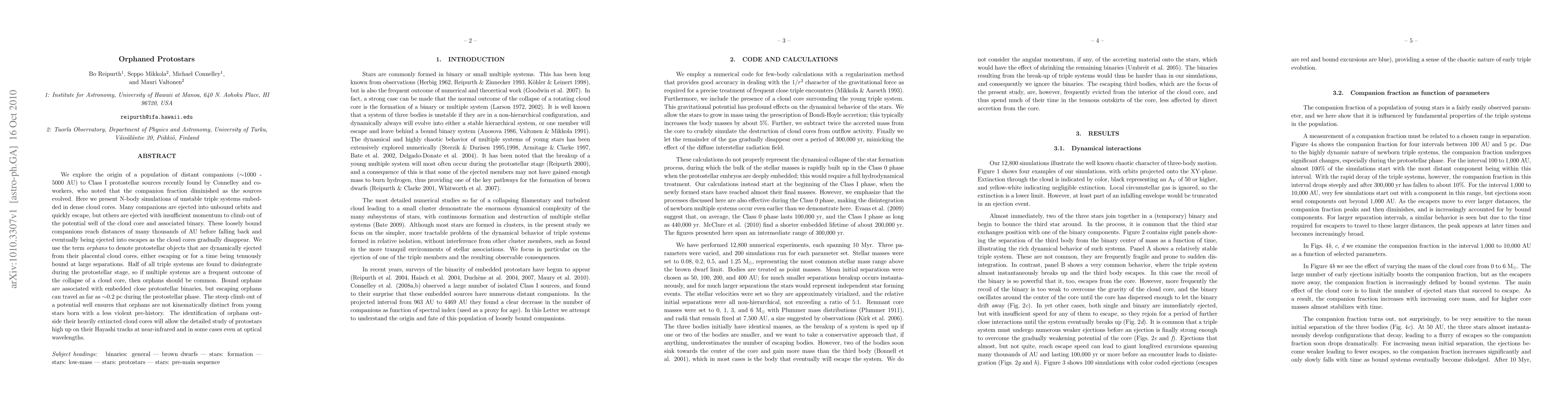 We explore the origin of a population of distant companions (~1000 - 5000 AU) to Class I protostellar sources recently found by Connelley and co-workers, who noted that the companion fraction diminished as the sources evolved. Here we present N-body simulations of unstable triple systems embedded in dense cloud cores. Many companions are ejected into unbound orbits and quickly escape, but others are ejected with insufficient momentum to climb out of the potential well of the cloud core and associated binary. These loosely bound companions reach distances of many thousands of AU before falling back and eventually being ejected into escapes as the cloud cores gradually disappear. We use the term orphans to denote protostellar objects that are dynamically ejected from their placental cloud cores, either escaping or for a time being tenuously bound at large separations. Half of all triple systems are found to disintegrate during the protostellar stage, so if multiple systems are a frequent outcome of the collapse of a cloud core, then orphans should be common. Bound orphans are associated with embedded close protostellar binaries, but escaping orphans can travel as far as ~0.2 pc during the protostellar phase. The steep climb out of a potential well ensures that orphans are not kinematically distinct from young stars born with a less violent pre-history. The identification of orphans outside their heavily extincted cloud cores will allow the detailed study of protostars high up on their Hayashi tracks at near-infrared and in some cases even at optical wavelengths.