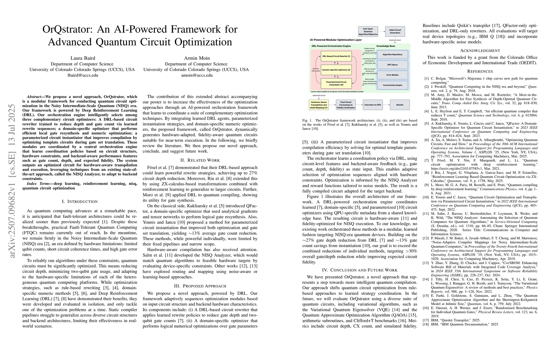 We propose a novel approach, OrQstrator, which is a modular framework for conducting quantum circuit optimization in the Noisy Intermediate-Scale Quantum (NISQ) era. Our framework is powered by Deep Reinforcement Learning (DRL). Our orchestration engine intelligently selects among three complementary circuit optimizers: A DRL-based circuit rewriter trained to reduce depth and gate count via learned rewrite sequences; a domain-specific optimizer that performs efficient local gate resynthesis and numeric optimization; a parameterized circuit instantiator that improves compilation by optimizing template circuits during gate set translation. These modules are coordinated by a central orchestration engine that learns coordination policies based on circuit structure, hardware constraints, and backend-aware performance features such as gate count, depth, and expected fidelity. The system outputs an optimized circuit for hardware-aware transpilation and execution, leveraging techniques from an existing state-of-the-art approach, called the NISQ Analyzer, to adapt to backend constraints.