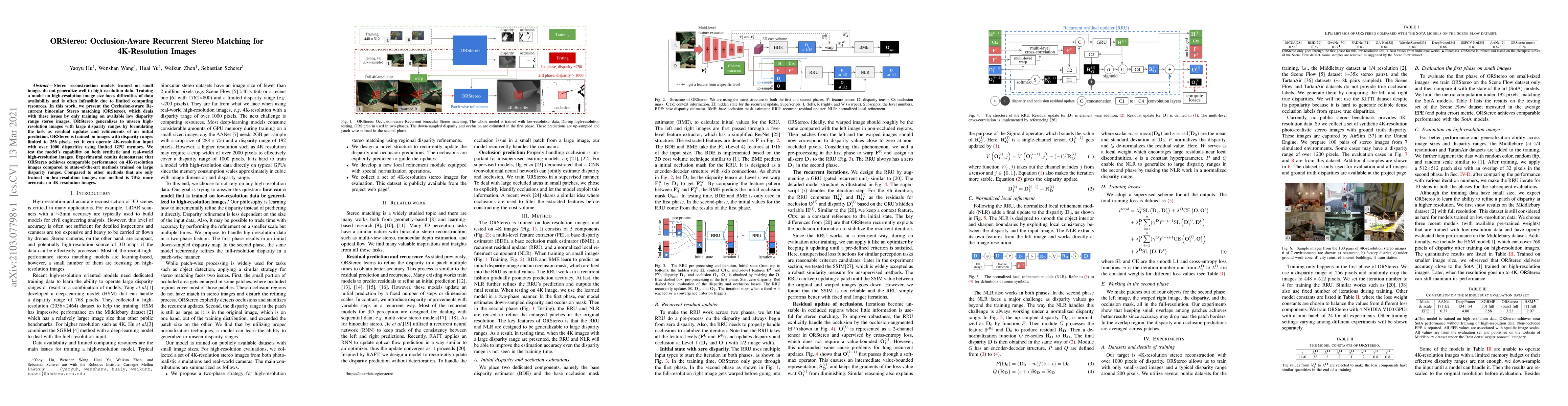 ORStereo is an occlusion-aware recurrent stereo matching model that trains on low-resolution images with limited disparity ranges, yet achieves comparable performance on 4K-resolution images by refining initial predictions. It demonstrates 70% higher accuracy on 4K images compared to low-resolution trained models.