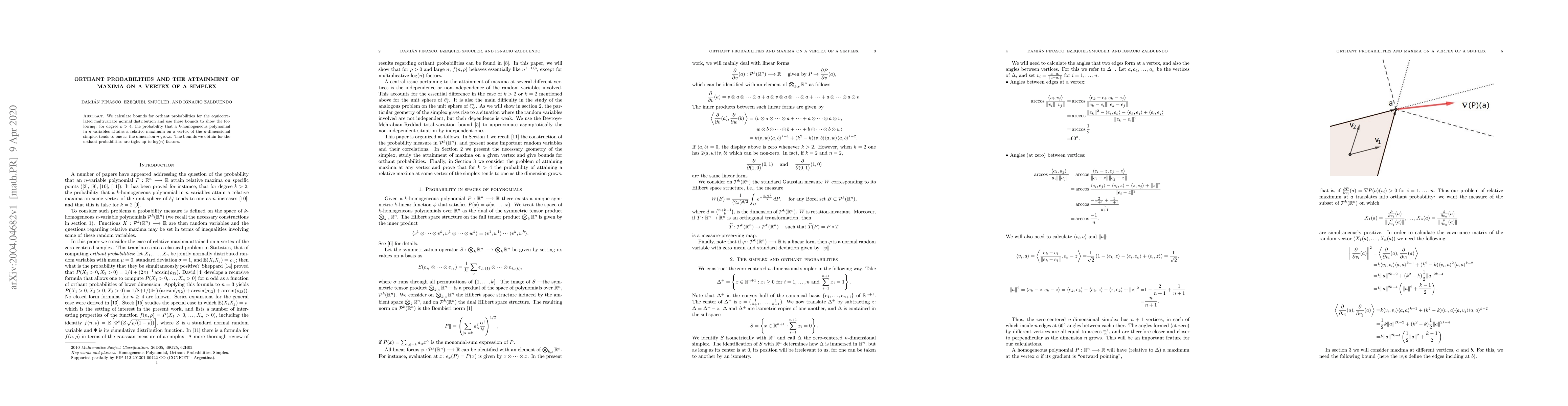 This paper calculates bounds for orthant probabilities in the equicorrelated multivariate normal distribution and demonstrates that for $k > 4$, the likelihood of a $k$-homogeneous polynomial attaining a relative maximum on a vertex of an $n$-dimensional simplex approaches one as $n$ increases. The derived bounds for orthant probabilities are tight up to $\log(n)$ factors.