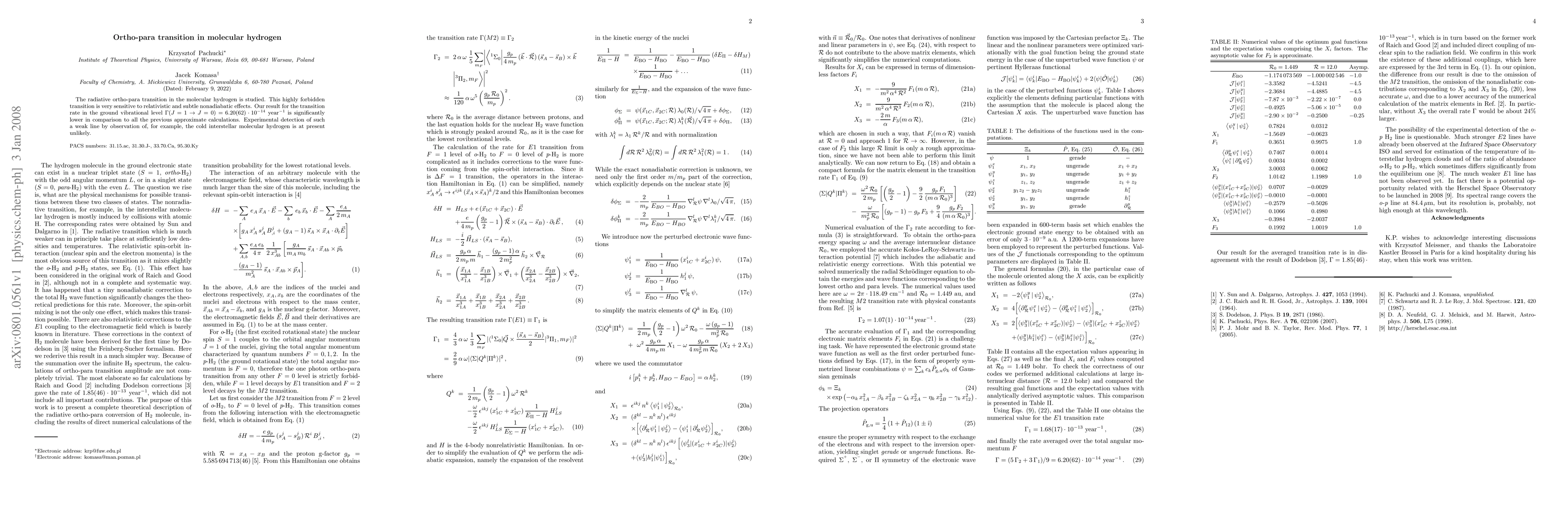 The paper presents a detailed theoretical analysis of the ortho-para transition in molecular hydrogen, incorporating relativistic and nonadiabatic effects, and deriving a more accurate transition rate than previous calculations.
