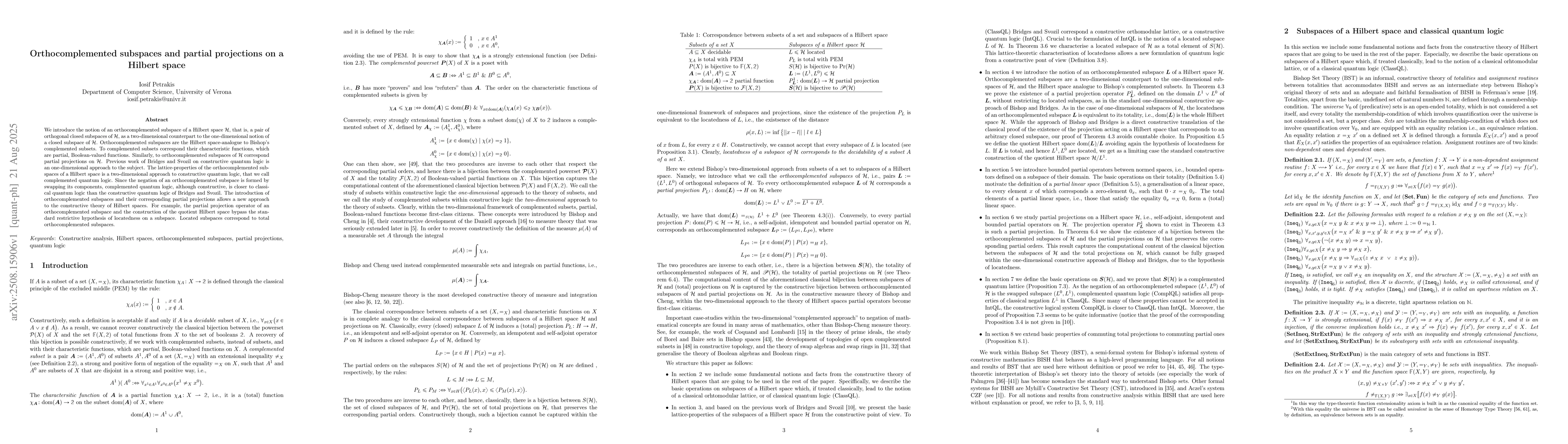 We introduce the notion of an orthocomplemented subspace of a Hilbert space H, that is, a pair of orthogonal closed subspaces of H, as a two-dimensional counterpart to the one-dimensional notion of a closed subspace of H. Orthocomplemented subspaces are the Hilbert space-analogue to Bishop's complemented subsets. To complemented subsets correspond their characteristic functions, which are partial, Boolean-valued functions. Similarly, to orthocomplemented subspaces of H correspond partial projections on H. Previous work of Bridges and Svozil on constructive quantum logic is an one-dimensional approach to the subject. The lattice-properties of the orthocomplemented subspaces of a Hilbert space is a two-dimensional approach to constructive quantum logic, that we call complemented quantum logic. Since the negation of an orthocomplemented subspace is formed by swapping its components, complemented quantum logic, although constructive, is closer to classical quantum logic than the constructive quantum logic of Bridges and Svozil. The introduction of orthocomplemented subspaces and their corresponding partial projections allows a new approach to the constructive theory of Hilbert spaces. For example, the partial projection operator of an orthocomplemented subspace and the construction of the quotient Hilbert space bypass the standard restrictive hypothesis of locatedness on a subspace. Located subspaces correspond to total orthocomplemented subspaces.