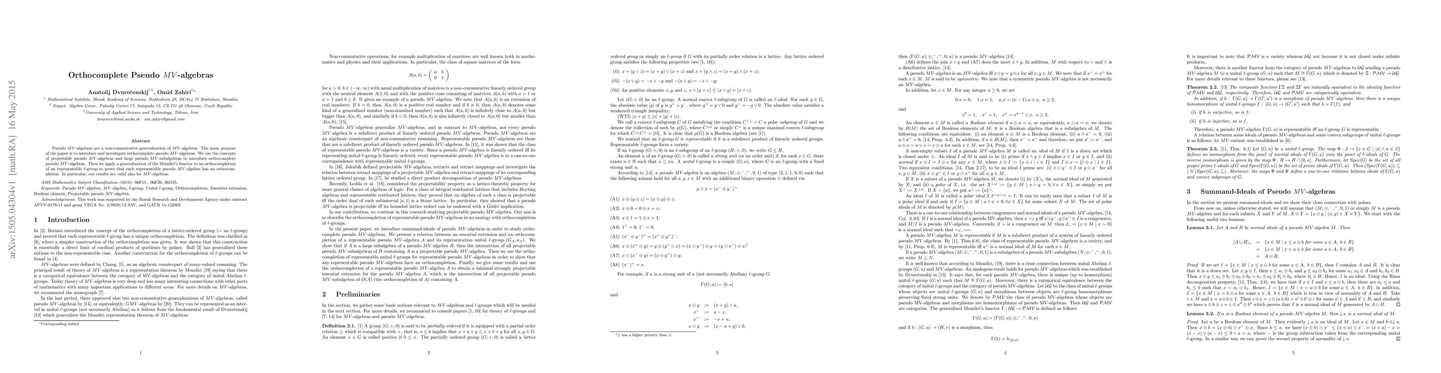 The paper presents a novel approach to defining and studying orthocomplete pseudo MV-algebras, along with a method for constructing orthocompletions of representable pseudo MV-algebras using a generalized Mundici functor.