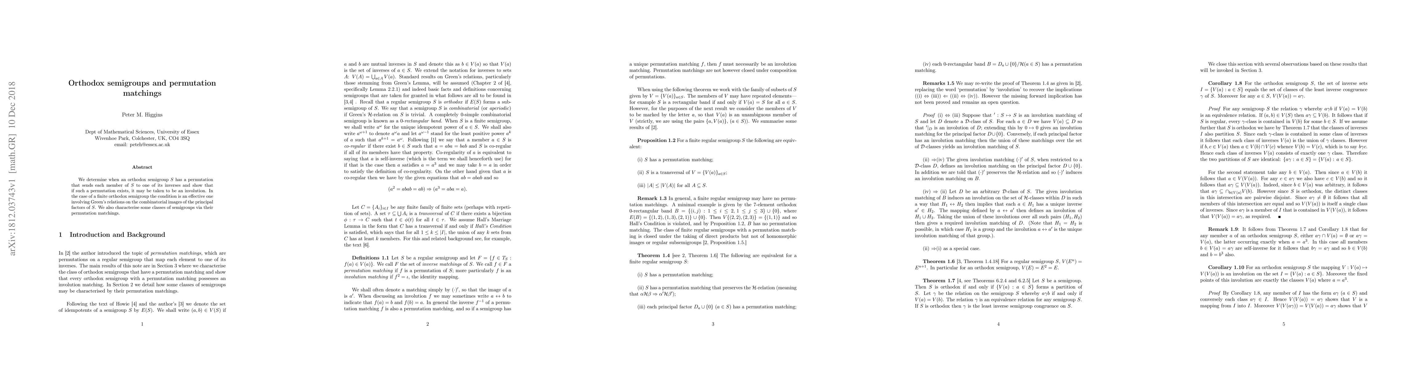 We determine when an orthodox semigroup S has a permutation that sends each member of S to one of its inverses and show that if such a permutation exists, it may be taken to be an involution. In the case of a finite orthodox semigroup the condition is an effective one involving Green's relations on the combinatorial images of the principal factors of S. We also characterise some classes of semigroups via their permutation matchings.