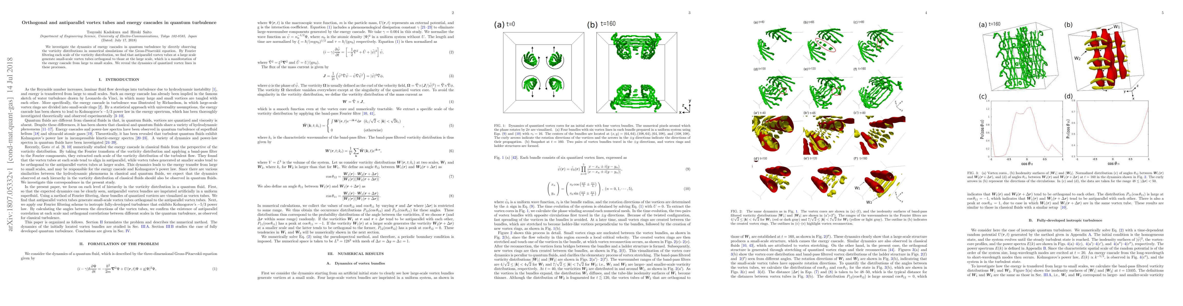 This paper explores the dynamics of energy cascades in quantum turbulence through numerical simulations, revealing that antiparallel vortex tubes at large scales generate orthogonal vortex tubes at small scales, demonstrating the energy transfer from large to small scales. The study also examines the behavior of quantized vortex lines during these processes.
