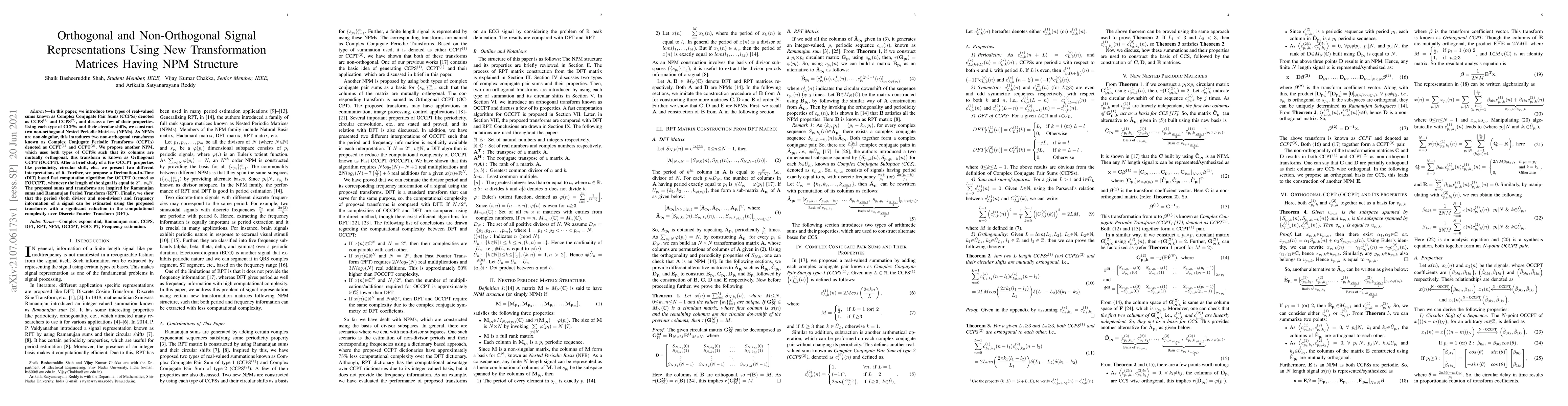 In this paper, we introduce two types of real-valued sums known as Complex Conjugate Pair Sums (CCPSs) denoted as CCPS$^{(1)}$ and CCPS$^{(2)}$, and discuss a few of their properties. Using each type of CCPSs and their circular shifts, we construct two non-orthogonal Nested Periodic Matrices (NPMs). As NPMs are non-singular, this introduces two non-orthogonal transforms known as Complex Conjugate Periodic Transforms (CCPTs) denoted as CCPT$^{(1)}$ and CCPT$^{(2)}$. We propose another NPM, which uses both types of CCPSs such that its columns are mutually orthogonal, this transform is known as Orthogonal CCPT (OCCPT). After a brief study of a few OCCPT properties like periodicity, circular shift, etc., we present two different interpretations of it. Further, we propose a Decimation-In-Time (DIT) based fast computation algorithm for OCCPT (termed as FOCCPT), whenever the length of the signal is equal to $2^v,\ v{\in} \mathbb{N}$. The proposed sums and transforms are inspired by Ramanujan sums and Ramanujan Period Transform (RPT). Finally, we show that the period (both divisor and non-divisor) and frequency information of a signal can be estimated using the proposed transforms with a significant reduction in the computational complexity over Discrete Fourier Transform (DFT).