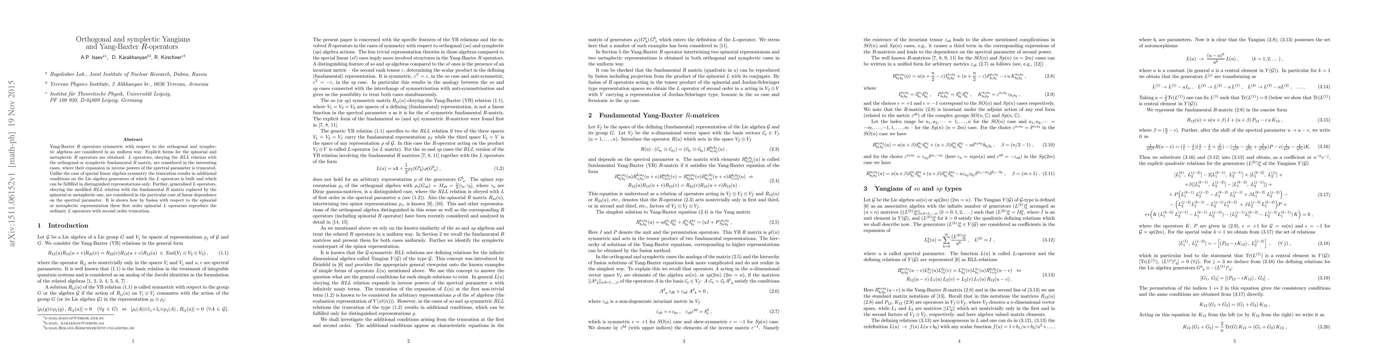Yang-Baxter R operators symmetric with respect to the orthogonal and symplectic algebras are considered in an uniform way. Explicit forms for the spinorial and metaplectic R operators are obtained. L operators, obeying the RLL relation with the orthogonal or symplectic fundamental R matrix, are considered in the interesting cases, where their expansion in inverse powers of the spectral parameter is truncated. Unlike the case of special linear algebra symmetry the truncation results in additional conditions on the Lie algebra generators of which the L operators is built and which can be fulfilled in distinguished representations only. Further, generalised L operators, obeying the modified RLL relation with the fundamental R matrix replaced by the spinorial or metaplectic one, are considered in the particular case of linear dependence on the spectral parameter. It is shown how by fusion with respect to the spinorial or metaplectic representation these first order spinorial L operators reproduce the ordinary L operators with second order truncation.