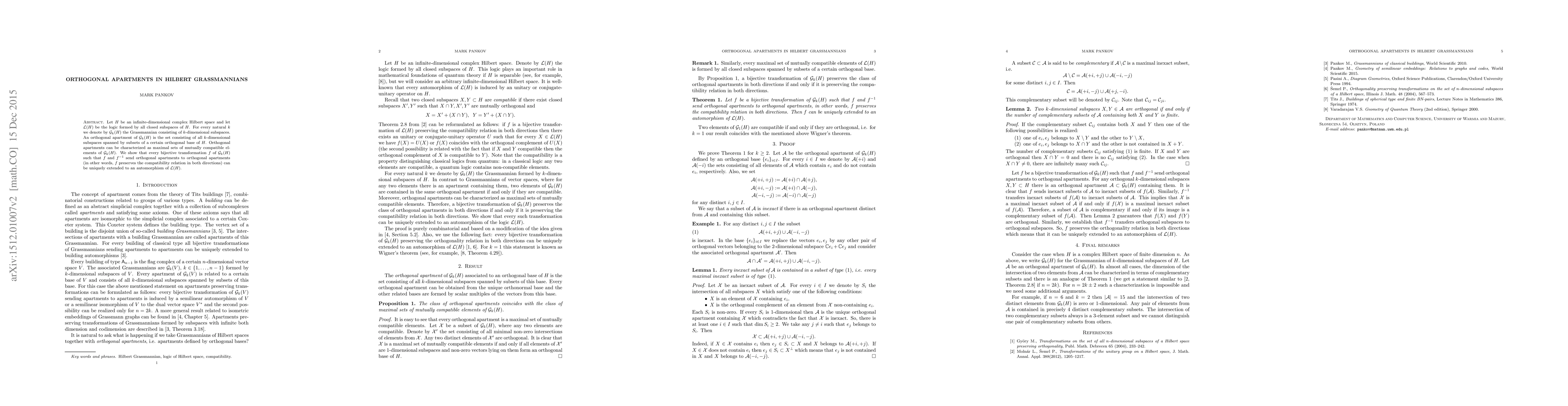 This paper investigates the structure of orthogonal apartments in Hilbert Grassmannians, demonstrating that bijective transformations preserving the compatibility relation of these apartments can be extended to automorphisms of the logic of closed subspaces of the Hilbert space.