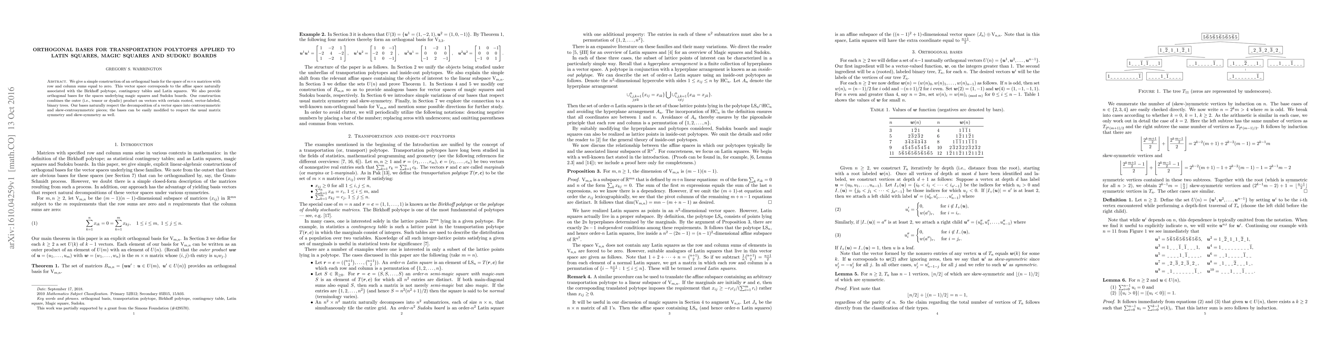 Summary: This paper constructs orthogonal bases for matrices associated with transportation polytopes, Latin squares, magic squares, and Sudoku boards using tensor products and binary trees, respecting centrosymmetric and skew-centrosymmetric decompositions. The construction also accommodates matrix symmetry and skew-symmetry.