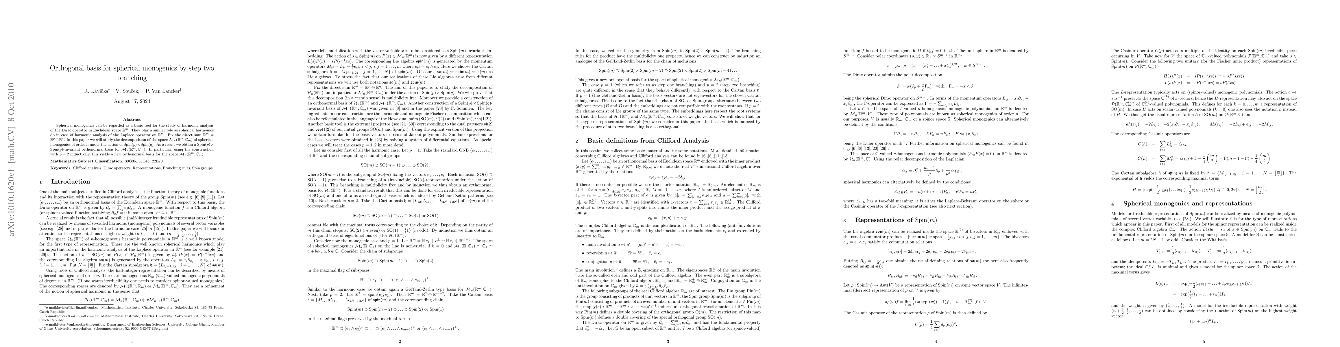 This paper develops an orthogonal basis for spherical monogenics using a step two branching method, focusing on the decomposition of the space of spherical monogenics under the action of Spin(p) x Spin(q). The result is a Spin(p) x Spin(q)-invariant orthonormal basis for the space of spherical monogenics.