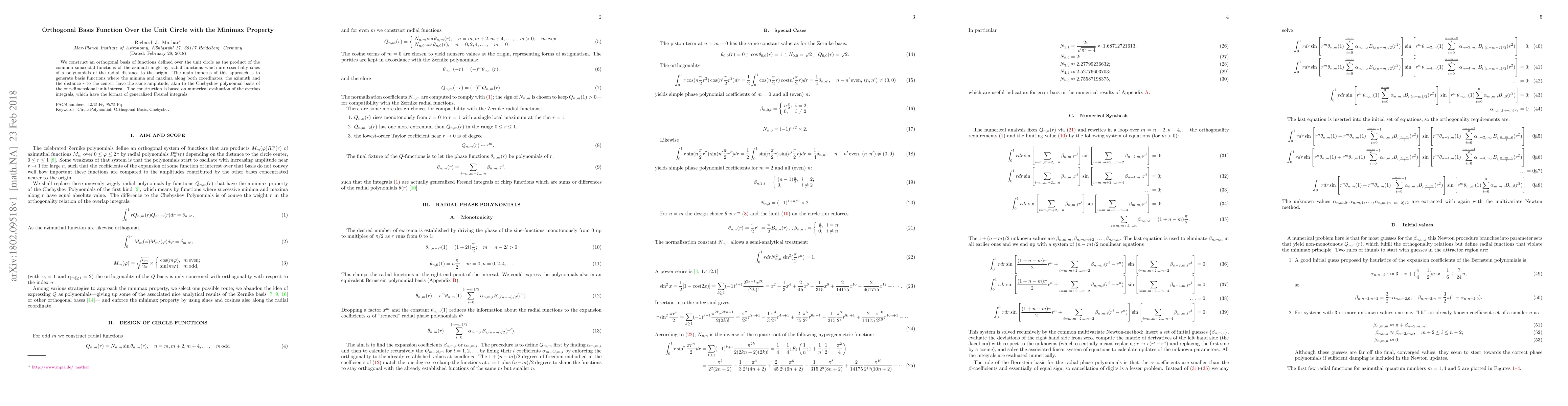We construct an orthogonal basis of functions defined over the unit circle as the product of the common sinusoidal functions of the azimuth angle by radial functions which are essentially sines of a polynomials of the radial distance to the origin. The main impetus of this approach is to generate basis functions where the minima and maxima along both coordinates, the azimuth and the distance r to the center, have the same amplitude, akin to the Chebyshev polynomial basis of the one-dimensional unit interval. The construction is based on numerical evaluation of the overlap integrals, which have the format of generalized Fresnel integrals.