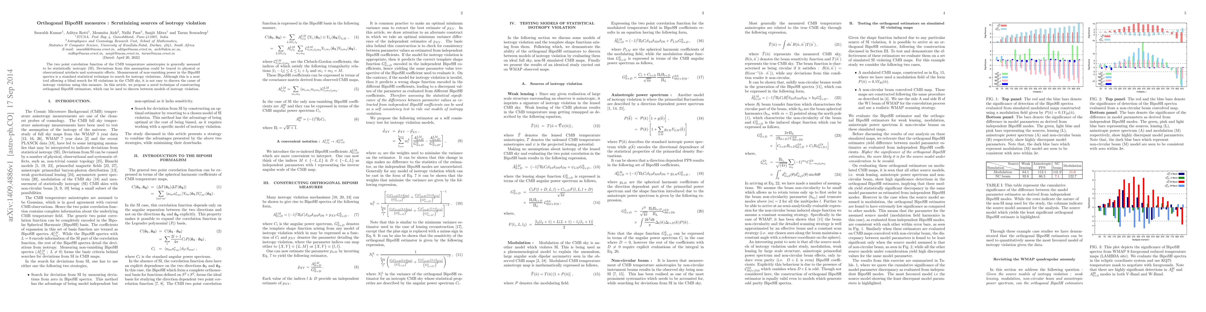 The two point correlation function of the CMB temperature anisotropies is generally assumed to be statistically isotropic (SI). Deviations from this assumption could be traced to physical or observational artefacts and systematic effects. Measurement of non-vanishing power in the BipoSH spectra is a standard statistical technique to search for isotropy violations. Although this is a neat tool allowing a blind search for SI violations in the CMB sky, it is not easy to discern the cause of isotropy violation using this measure. In this article, we propose a novel technique of constructing orthogonal BipoSH estimators, which can be used to discern between models of isotropy violation.