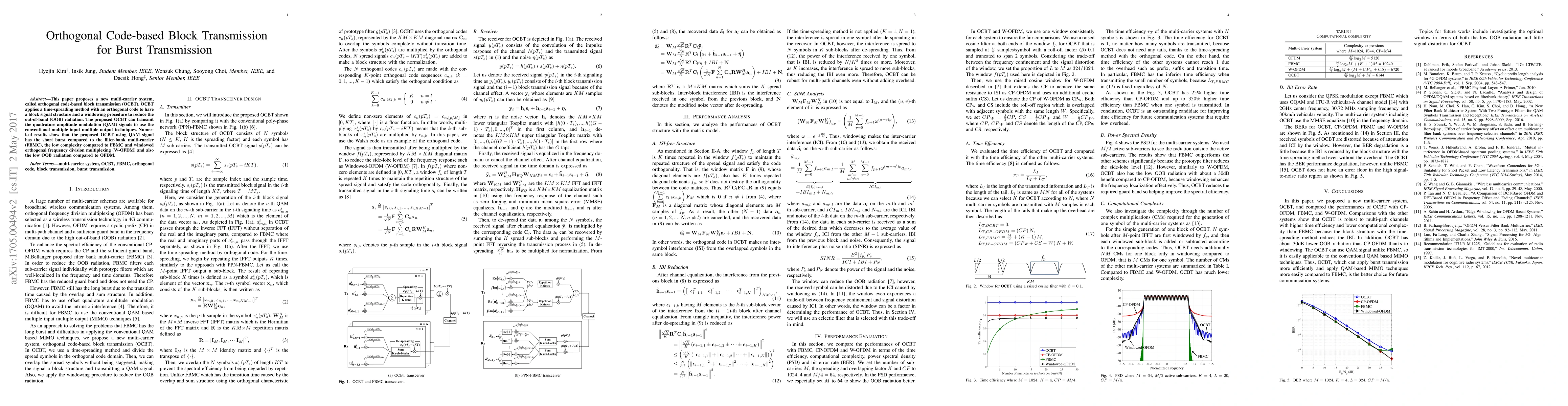 This paper proposes a new multi-carrier system called orthogonal code-based block transmission (OCBT) that achieves low complexity, short burst length, and reduced out-of-band radiation compared to other techniques.
