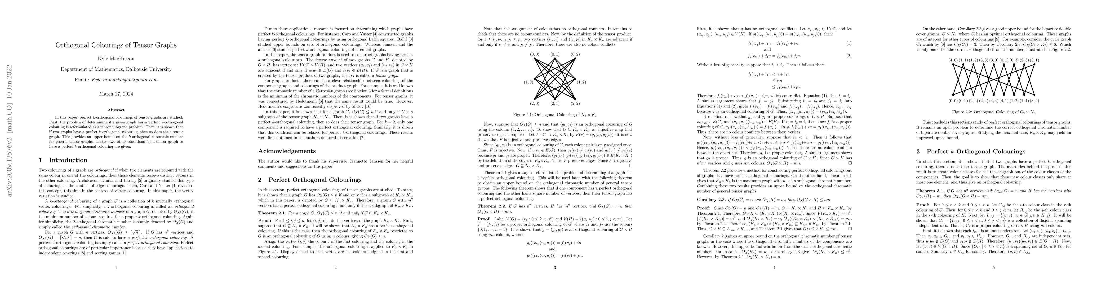This paper investigates perfect k-orthogonal colourings of tensor graphs, reformulating the problem of determining if a given graph has a perfect 2-orthogonal colouring as a tensor subgraph problem. It establishes that the tensor graph of two graphs with perfect k-orthogonal colourings also has such a colouring, providing an upper bound on the k-orthogonal chromatic number for general tensor graphs.