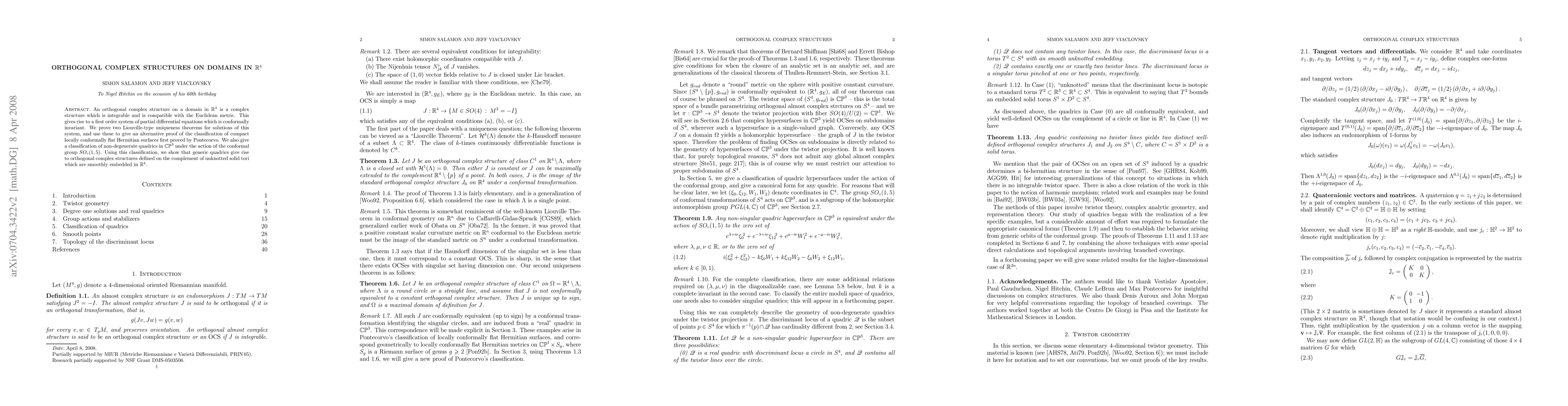 An orthogonal complex structure on a domain in R^4 is a complex structure which is integrable and is compatible with the Euclidean metric. This gives rise to a first order system of partial differential equations which is conformally invariant. We prove two Liouville-type uniqueness theorems for solutions of this system, and use these to give an alternative proof of the classification of compact locally conformally flat Hermitian surfaces first proved by Pontecorvo. We also give a classification of non-degenerate quadrics in CP^3 under the action of the conformal group. Using this classification, we show that generic quadrics give rise to orthogonal complex structures defined on the complement of unknotted solid tori which are smoothly embedded in R^4.