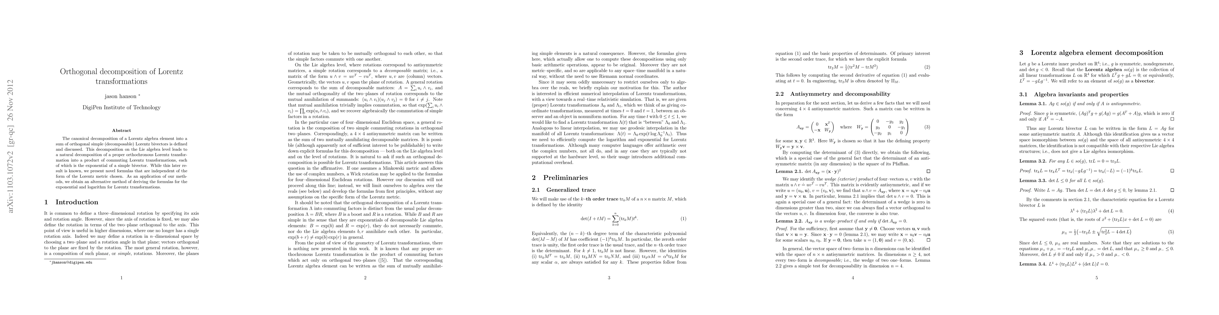 This paper explores the orthogonal decomposition of Lorentz transformations into simple bivectors and presents a method to express proper orthochronous Lorentz transformations as products of commuting exponentials of these bivectors, providing an alternative derivation for Lorentz transformation formulas.