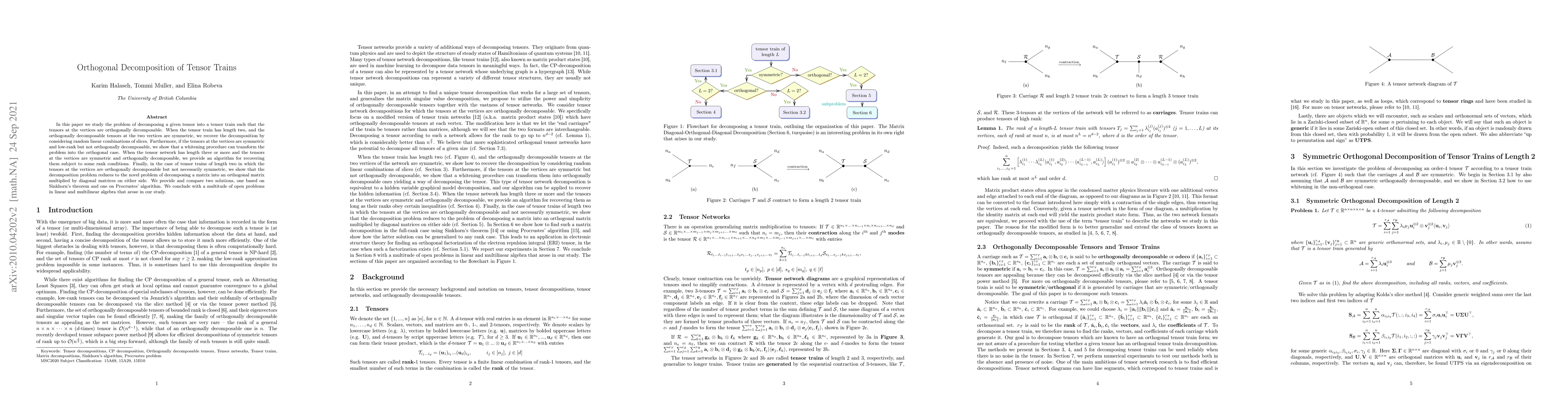 This paper investigates the orthogonal decomposition of tensor trains, providing methods for reconstructing symmetric and orthogonal tensors in various network lengths. It introduces algorithms for specific rank conditions and discusses solutions for non-symmetric tensors, concluding with open problems in linear and multilinear algebra.