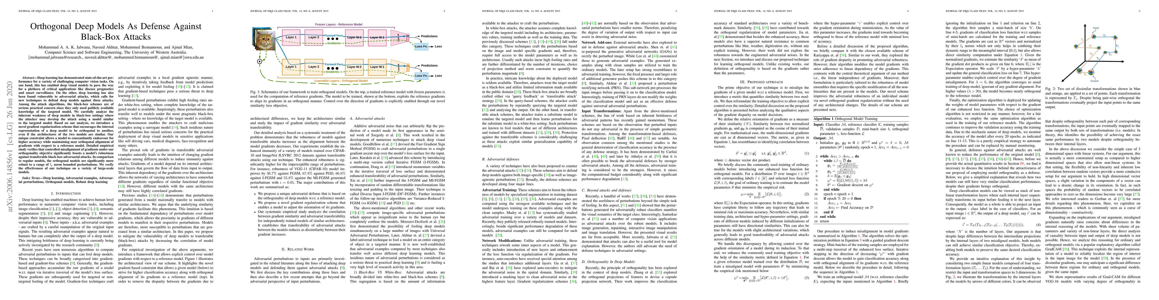 Deep learning has demonstrated state-of-the-art performance for a variety of challenging computer vision tasks. On one hand, this has enabled deep visual models to pave the way for a plethora of critical applications like disease prognostics and smart surveillance. On the other, deep learning has also been found vulnerable to adversarial attacks, which calls for new techniques to defend deep models against these attacks. Among the attack algorithms, the black-box schemes are of serious practical concern since they only need publicly available knowledge of the targeted model. We carefully analyze the inherent weakness of deep models in black-box settings where the attacker may develop the attack using a model similar to the targeted model. Based on our analysis, we introduce a novel gradient regularization scheme that encourages the internal representation of a deep model to be orthogonal to another, even if the architectures of the two models are similar. Our unique constraint allows a model to concomitantly endeavour for higher accuracy while maintaining near orthogonal alignment of gradients with respect to a reference model. Detailed empirical study verifies that controlled misalignment of gradients under our orthogonality objective significantly boosts a model's robustness against transferable black-box adversarial attacks. In comparison to regular models, the orthogonal models are significantly more robust to a range of $l_p$ norm bounded perturbations. We verify the effectiveness of our technique on a variety of large-scale models.