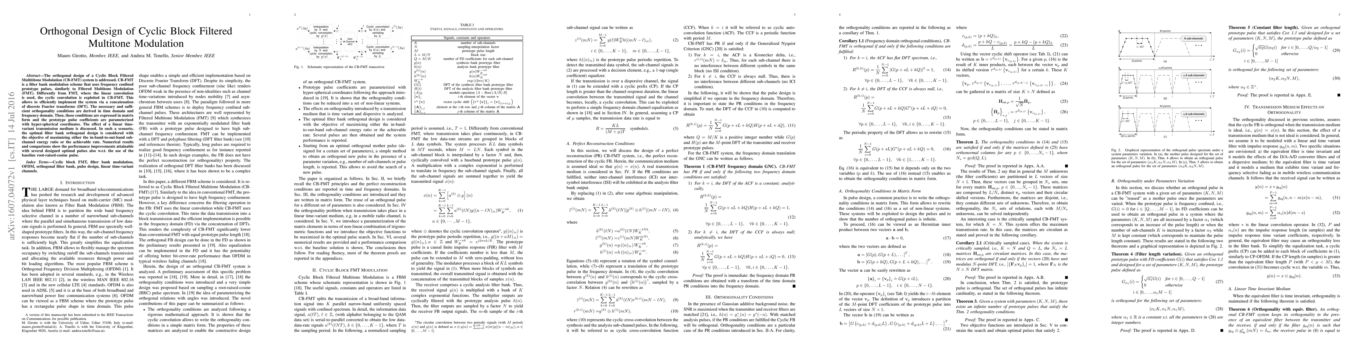 This research derives orthogonality conditions for Cyclic Block Filtered Multitone Modulation (CB-FMT), a filter bank scheme using cyclic convolution and DFTs for efficient implementation. It discusses optimal filter bank design for time-variant channels, parameterizing prototype pulses with hyper-spherical coordinates to maximize sub-channel energy ratio or achievable rate, demonstrating performance improvements over conventional pulses.