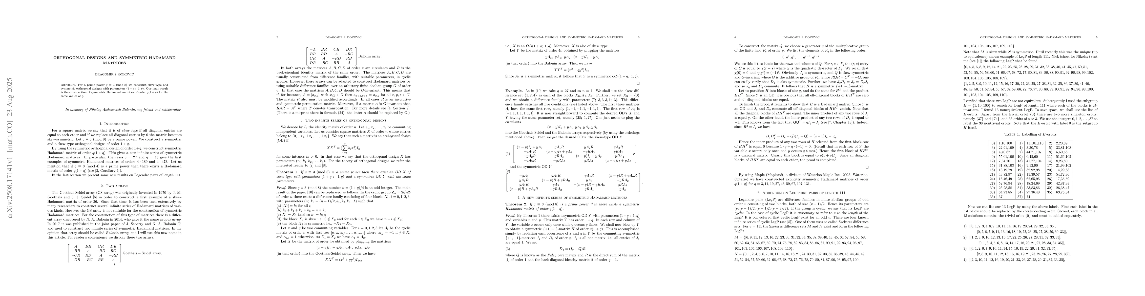 Our main result is the construction of symmetric Hadamard matrices of order q(1 + q) where q is a prime power congruent to 3 mod 8.