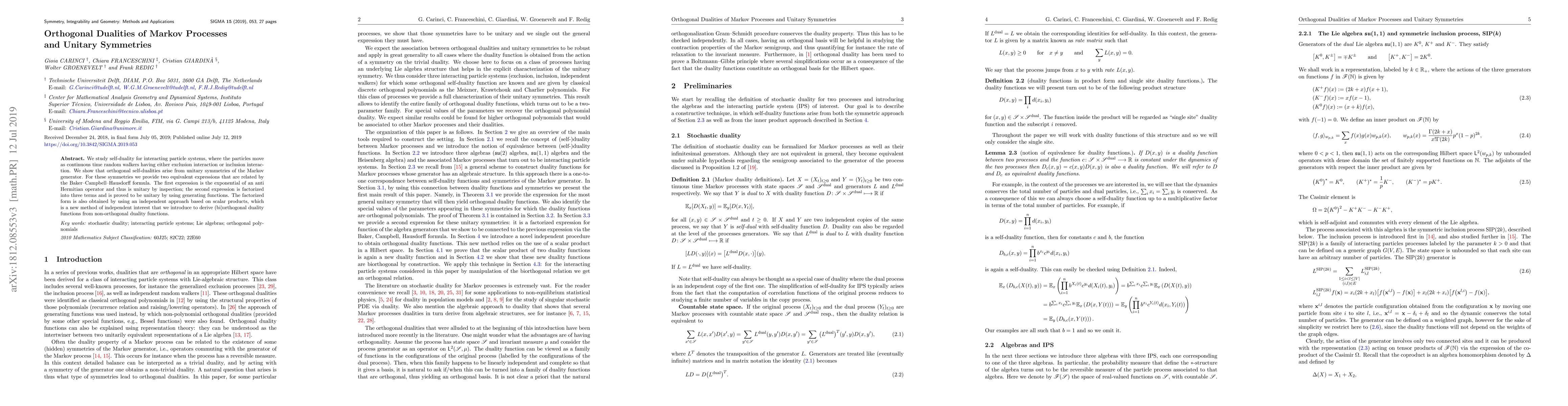 This paper investigates self-dualities in interacting particle systems, demonstrating that orthogonal self-dualities emerge from unitary symmetries of the Markov generator. It provides two unitary expressions related by the Baker-Campbell-Hausdorff formula and introduces a novel method for deriving biorthogonal duality functions from non-orthogonal ones.