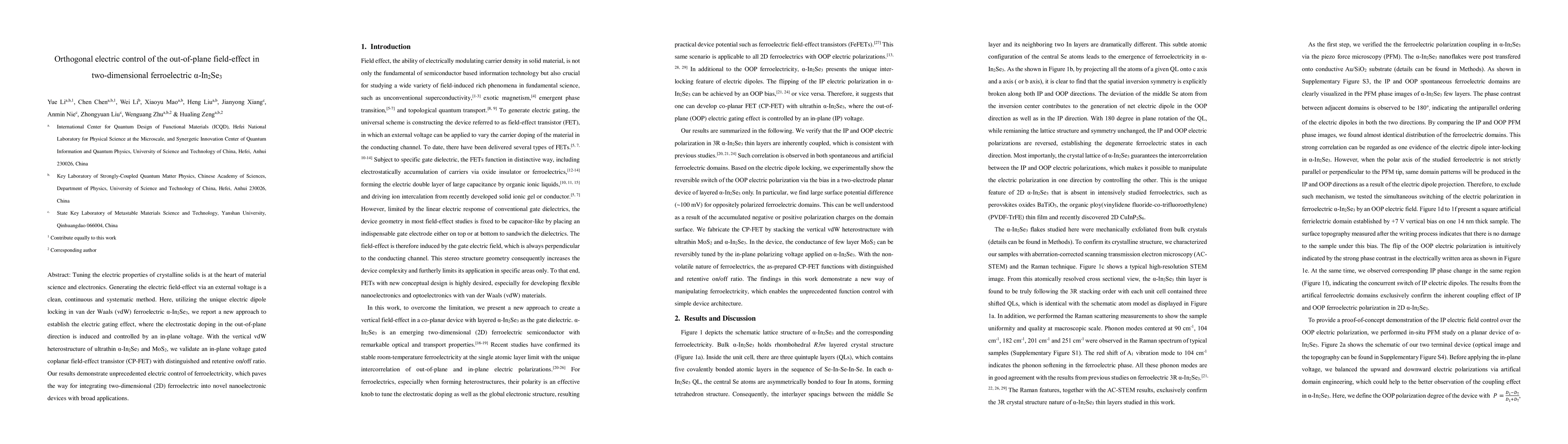 This paper reports a new method to orthogonally control the out-of-plane field-effect in the 2D ferroelectric alpha-In2Se3 using an in-plane voltage, enabling efficient electrostatic doping and demonstrating a high on/off ratio in a coplanar field-effect transistor. This breakthrough opens avenues for integrating 2D ferroelectric materials into advanced nanoelectronic devices.
