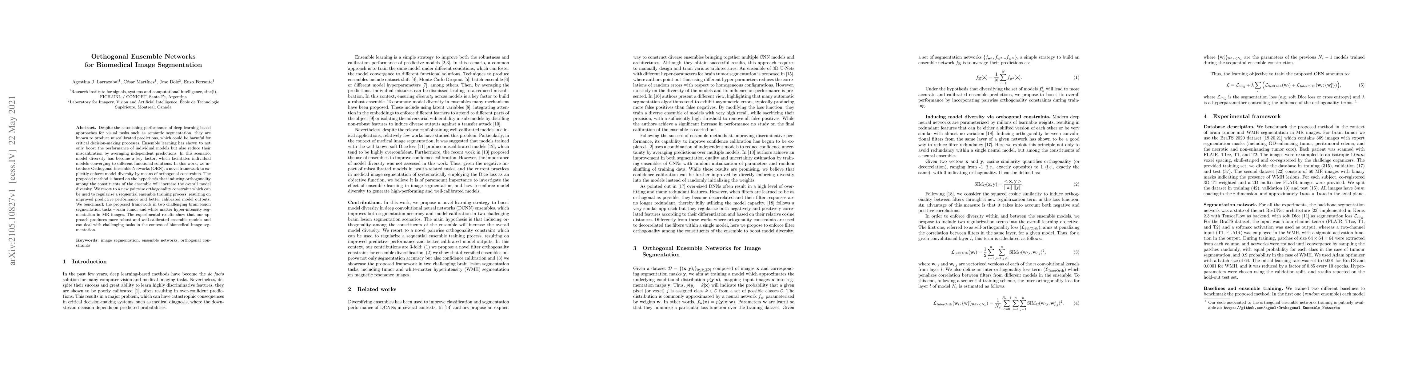 Despite the astonishing performance of deep-learning based approaches for visual tasks such as semantic segmentation, they are known to produce miscalibrated predictions, which could be harmful for critical decision-making processes. Ensemble learning has shown to not only boost the performance of individual models but also reduce their miscalibration by averaging independent predictions. In this scenario, model diversity has become a key factor, which facilitates individual models converging to different functional solutions. In this work, we introduce Orthogonal Ensemble Networks (OEN), a novel framework to explicitly enforce model diversity by means of orthogonal constraints. The proposed method is based on the hypothesis that inducing orthogonality among the constituents of the ensemble will increase the overall model diversity. We resort to a new pairwise orthogonality constraint which can be used to regularize a sequential ensemble training process, resulting on improved predictive performance and better calibrated model outputs. We benchmark the proposed framework in two challenging brain lesion segmentation tasks --brain tumor and white matter hyper-intensity segmentation in MR images. The experimental results show that our approach produces more robust and well-calibrated ensemble models and can deal with challenging tasks in the context of biomedical image segmentation.