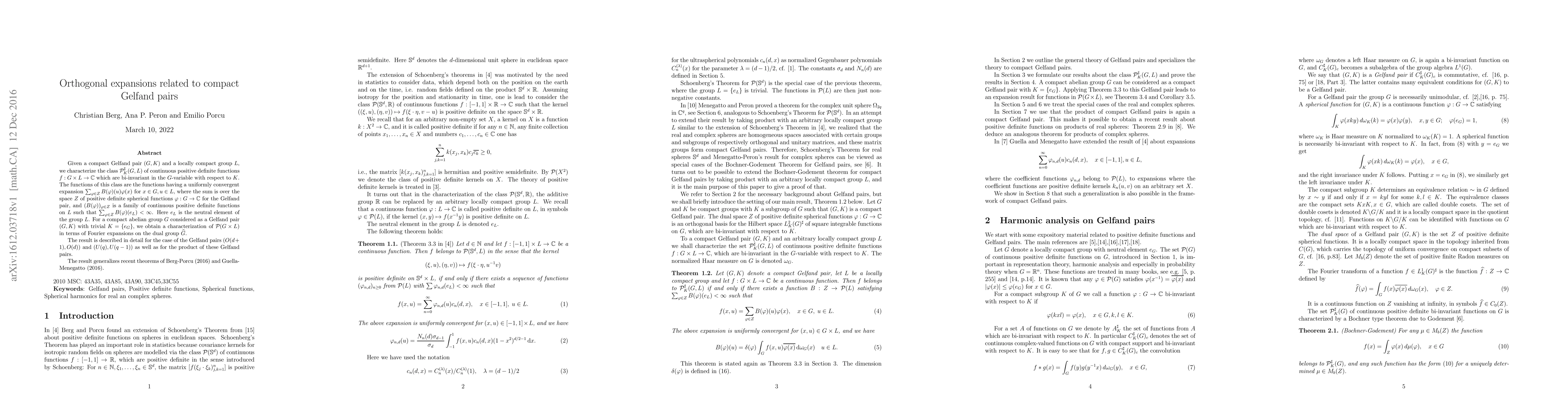 This paper characterizes the class of continuous positive definite functions on the product of a compact Gelfand pair and a locally compact group, which have an orthogonal expansion in terms of spherical functions. It generalizes recent results by Berg-Porcu and Guella-Menegatto, and provides detailed descriptions for specific Gelfand pairs like (O(d+1),O(d)) and (U(q),U(q-1)).