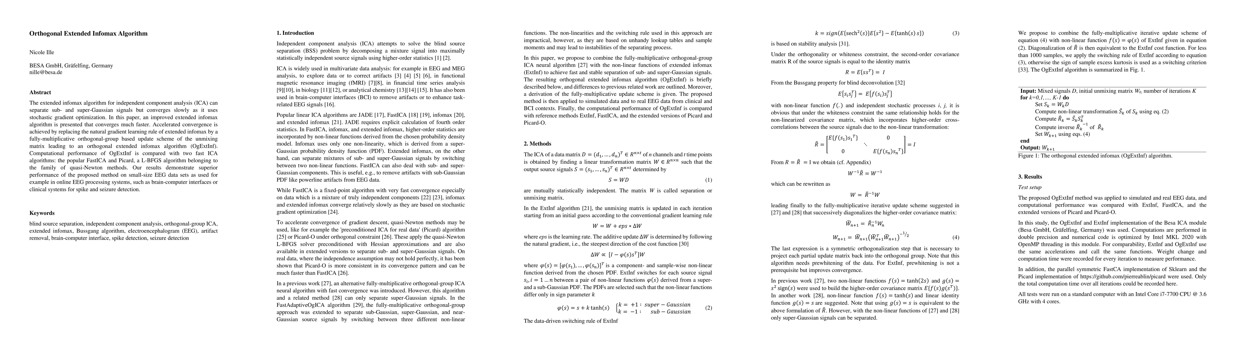 This paper introduces an orthogonal extended infomax algorithm (OgExtInf) that enhances the convergence speed of independent component analysis (ICA) for separating signals. OgExtInf replaces the natural gradient with an orthogonal-group based update scheme, outperforming FastICA and Picard methods on small-size EEG datasets, especially in applications like brain-computer interfaces and seizure detection.