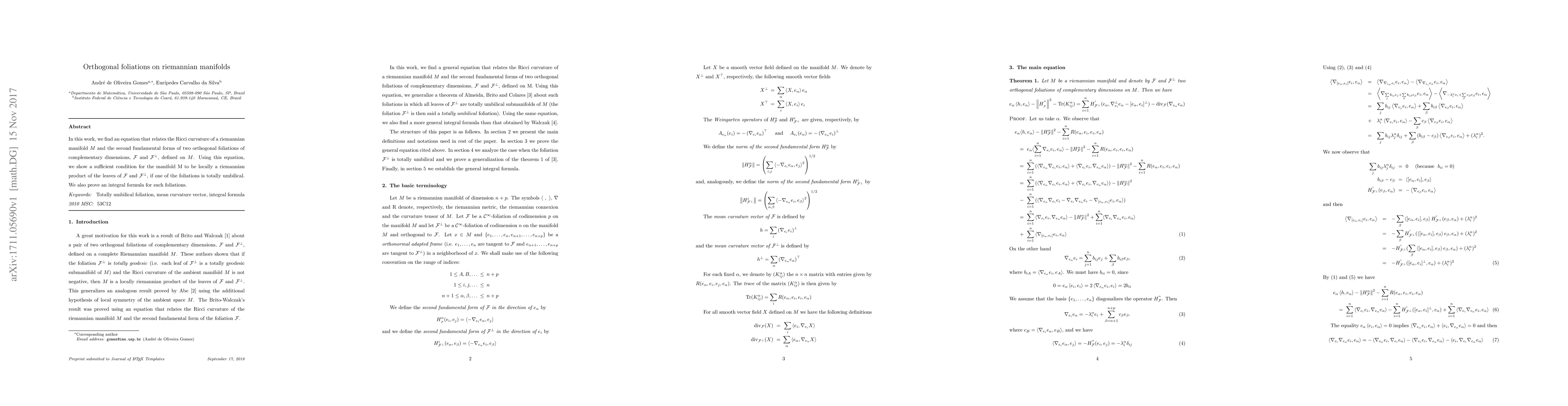 In this work, we find an equation that relates the Ricci curvature of a riemannian manifold $M$ and the second fundamental forms of two orthogonal foliations of complementary dimensions, $\mathcal{F}$ and $\mathcal{F}^{\bot}$, defined on $M$. Using this equation, we show a sufficient condition for the manifold M to be locally a riemannian product of the leaves of $\mathcal{F}$ and $\mathcal{F}^{\bot}$, if one of the foliations is totally umbilical. We also prove an integral formula for such foliations.