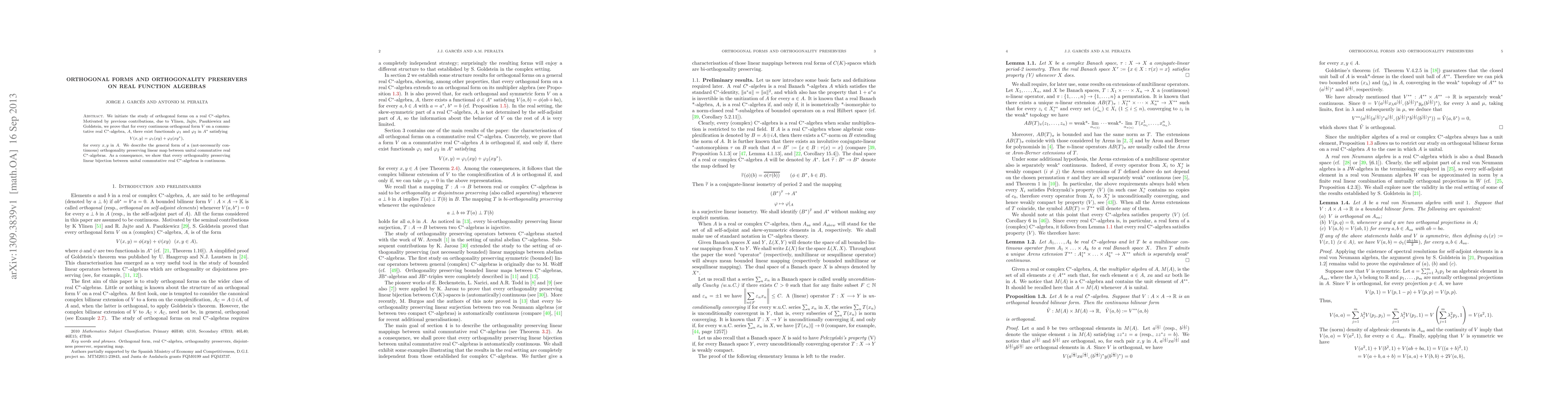 We initiate the study of orthogonal forms on a real C$^*$-algebra. Motivated by previous contributions, due to Ylinen, Jajte, Paszkiewicz and Goldstein, we prove that for every continuous orthogonal form $V$ on a commutative real C$^*$-algebra, $A$, there exist functionals $\varphi_1$ and $\varphi_2$ in $A^{*}$ satisfying $$V(x,y) = \varphi_1 (x y) + \varphi_2 (x y^*),$$ for every $x,y$ in $A$. We describe the general form of a (not-necessarily continuous) orthogonality preserving linear map between unital commutative real C$^*$-algebras. As a consequence, we show that every orthogonality preserving linear bijection between unital commutative real C$^*$-algebras is continuous.