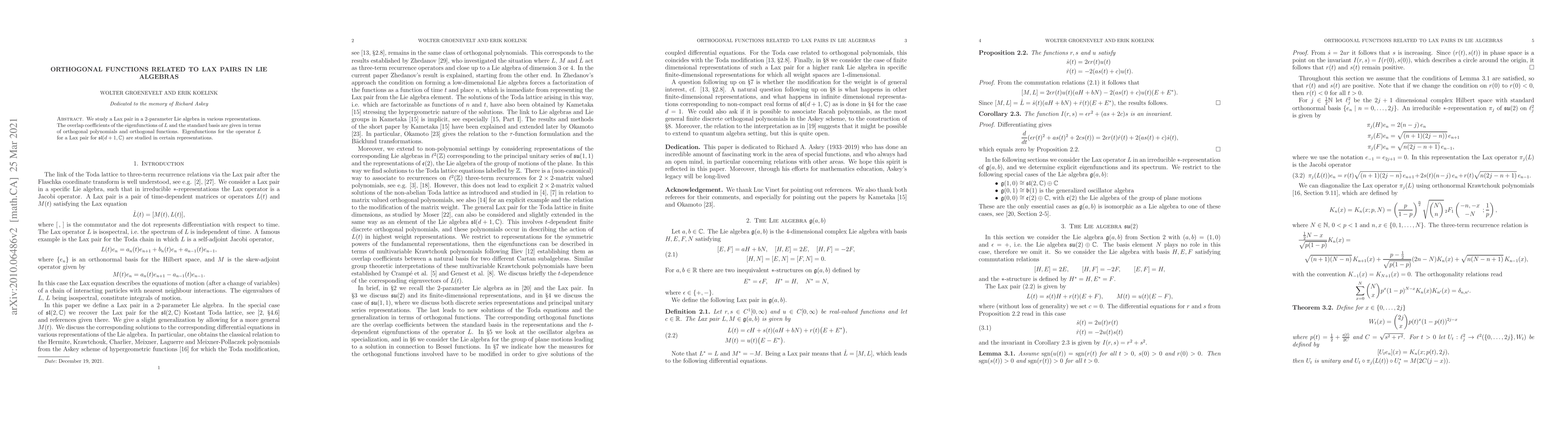 This paper investigates a Lax pair within a 2-parameter Lie algebra, expressing the overlap coefficients of eigenfunctions through orthogonal polynomials and functions. It also explores eigenfunctions of operator $L$ for $\mathfrak{sl}(d+1,\mathbb C)$ in specific representations.