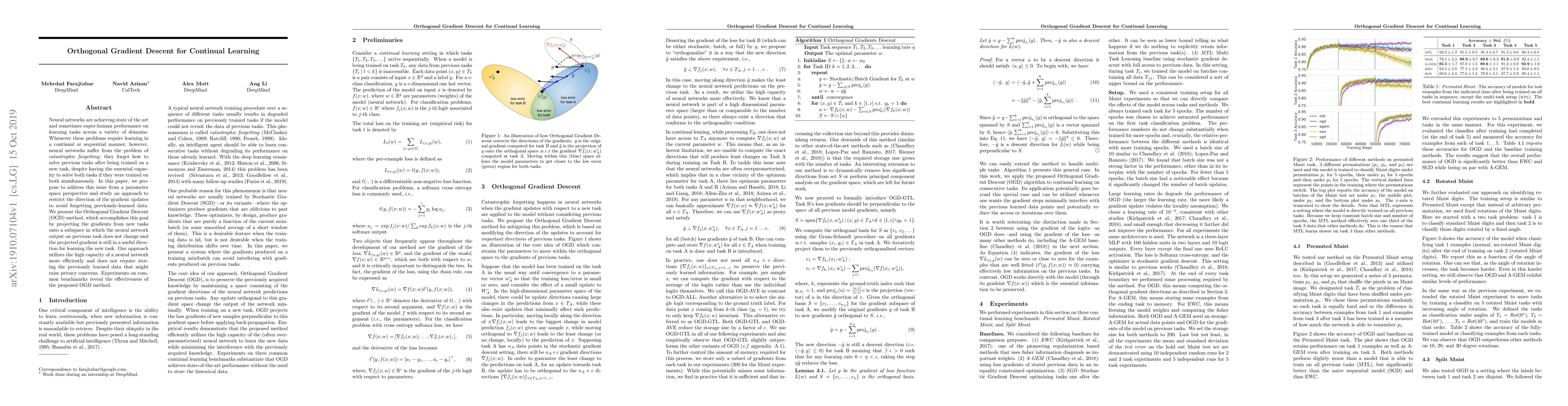 The paper proposes Orthogonal Gradient Descent (OGD) to tackle catastrophic forgetting in continual learning by projecting new task gradients onto a subspace that preserves previous task knowledge, enhancing neural network capacity without requiring data storage. Experiments show OGD's effectiveness in maintaining performance on both new and old tasks.