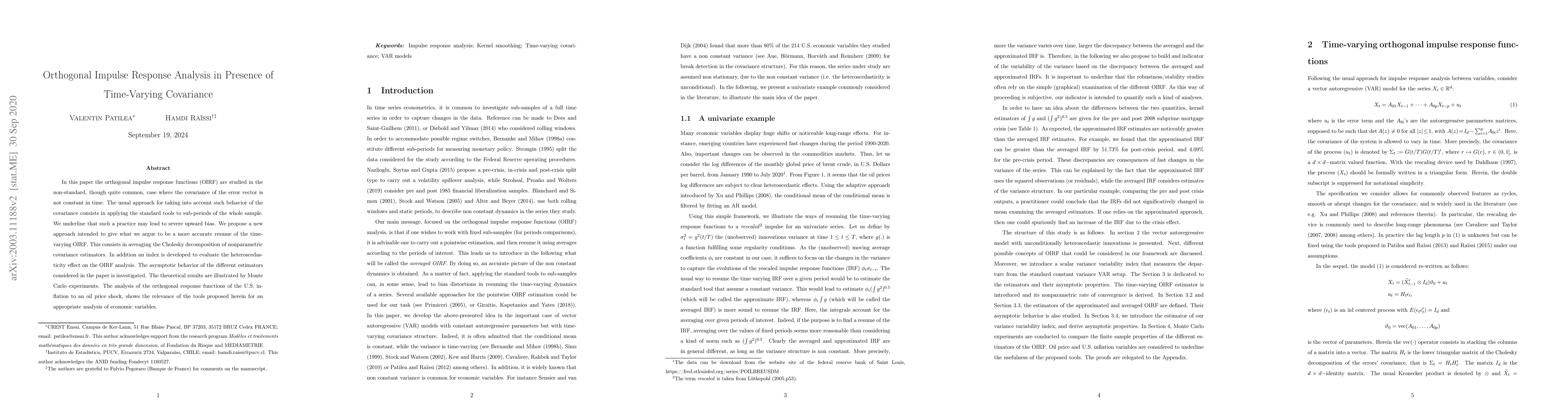 This paper proposes a new method for estimating orthogonal impulse response functions (OIRF) when the covariance of the error vector varies over time, addressing the upward bias of sub-period analysis. It introduces an averaging technique based on the Cholesky decomposition of nonparametric covariance estimators and evaluates the heteroscedasticity effect, supported by Monte Carlo experiments and an application to U.S. inflation following an oil price shock.