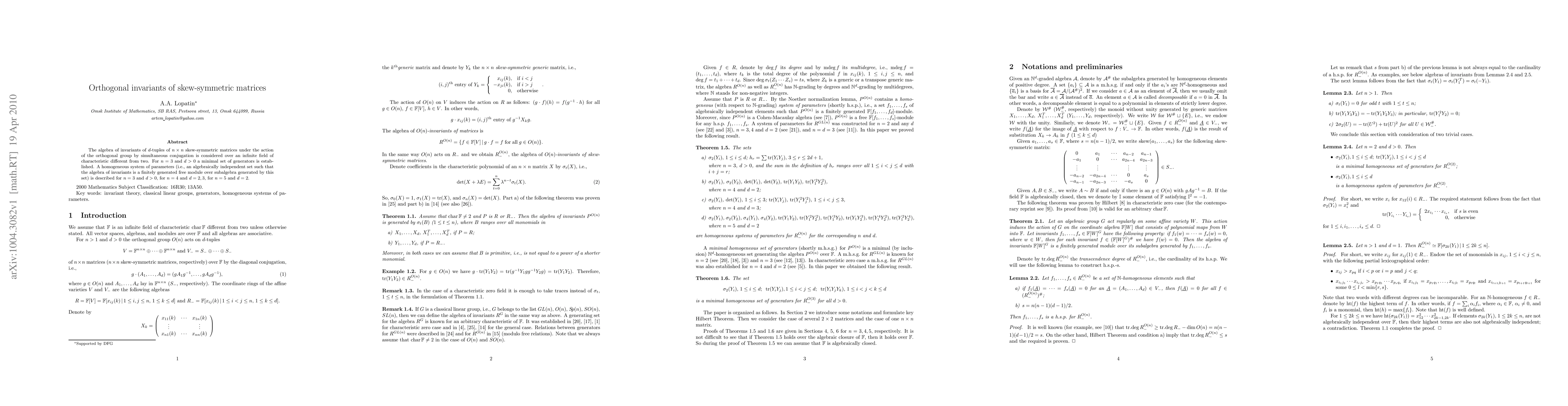 This paper establishes a minimal set of generators for the algebra of invariants of n x n skew-symmetric matrices under orthogonal group action for n=3 and d>0. It also describes a homogeneous system of parameters for n=3, n=4 with d=2,3, and n=5 with d=2.