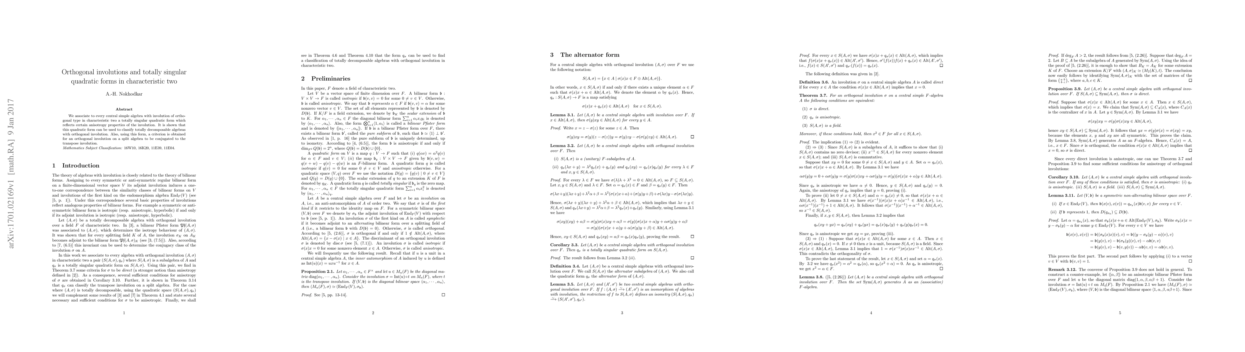 This paper associates a totally singular quadratic form with central simple algebras featuring orthogonal involutions in characteristic two, using it to classify decomposable algebras and establish a criterion for conjugate involutions on split algebras.