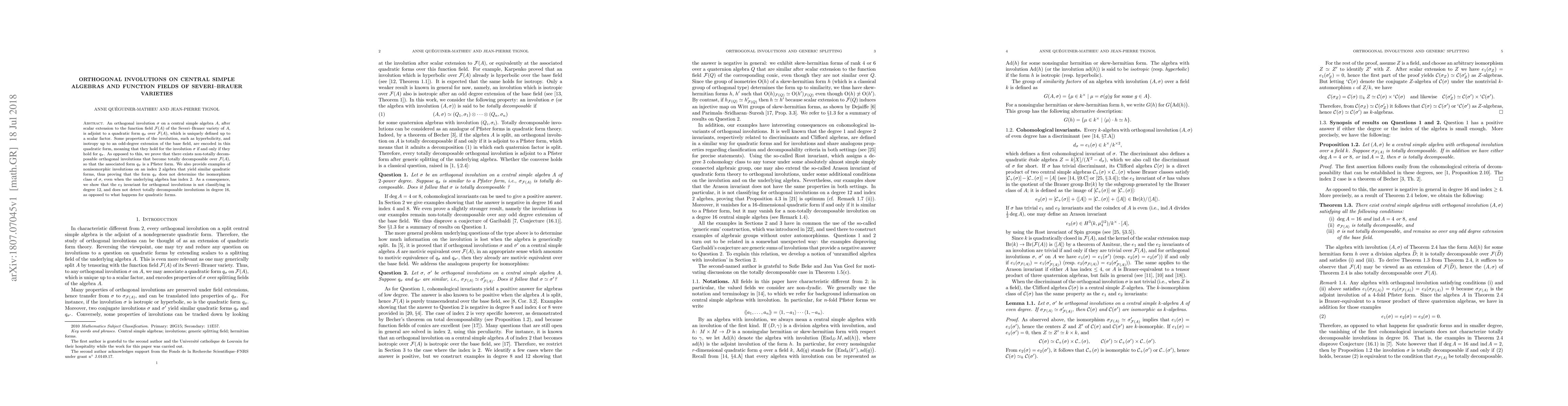 This paper explores orthogonal involutions on central simple algebras and their associated quadratic forms over function fields of Severi-Brauer varieties. It shows that these involutions and their properties can be encoded in quadratic forms but also demonstrates that such forms do not determine the involution's isomorphism class. The study concludes that the $e_3$ invariant fails to classify orthogonal involutions in certain degrees.