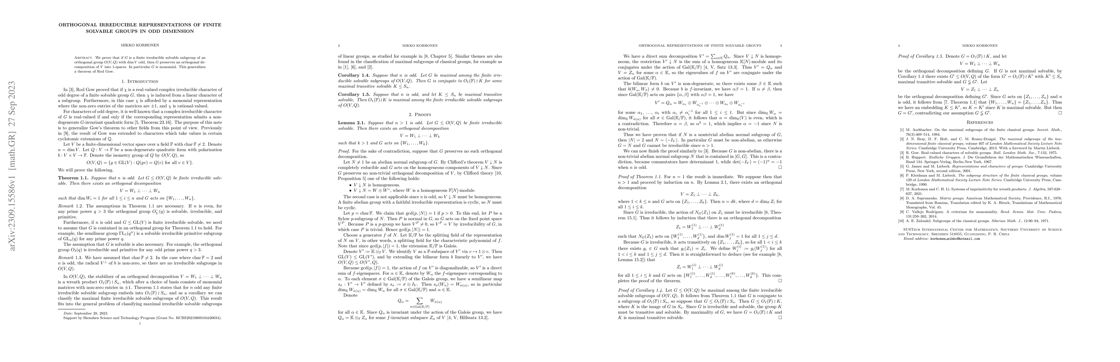 Summary: The paper proves that finite irreducible solvable subgroups of orthogonal groups acting on odd-dimensional spaces preserve an orthogonal decomposition into 1-spaces, thereby classifying them as monomial groups, extending a prior theorem by Rod Gow.