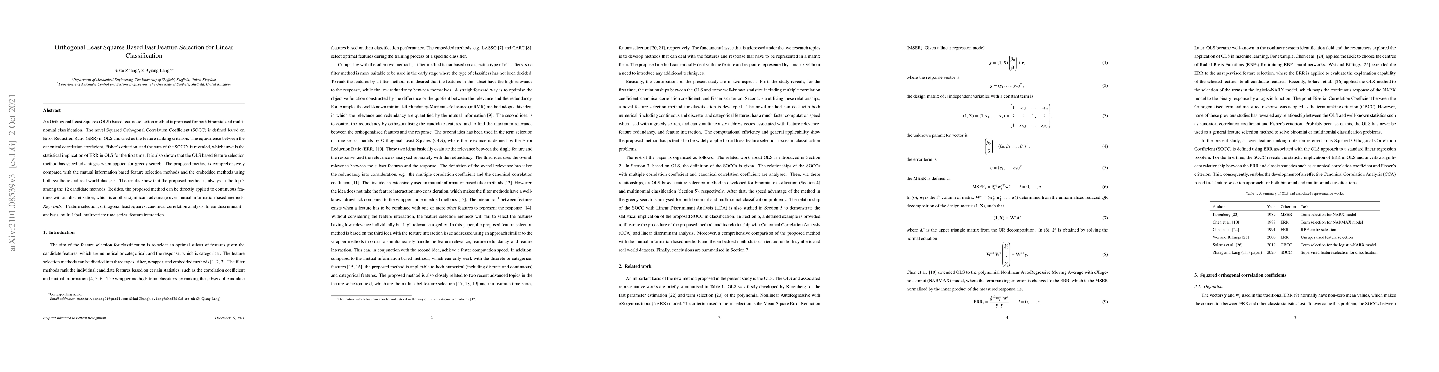This paper proposes an Orthogonal Least Squares (OLS) based feature selection method for linear classification, utilizing the Squared Orthogonal Correlation Coefficient (SOCC) as a ranking criterion. The method demonstrates speed advantages and outperforms other feature selection techniques in comparative studies.