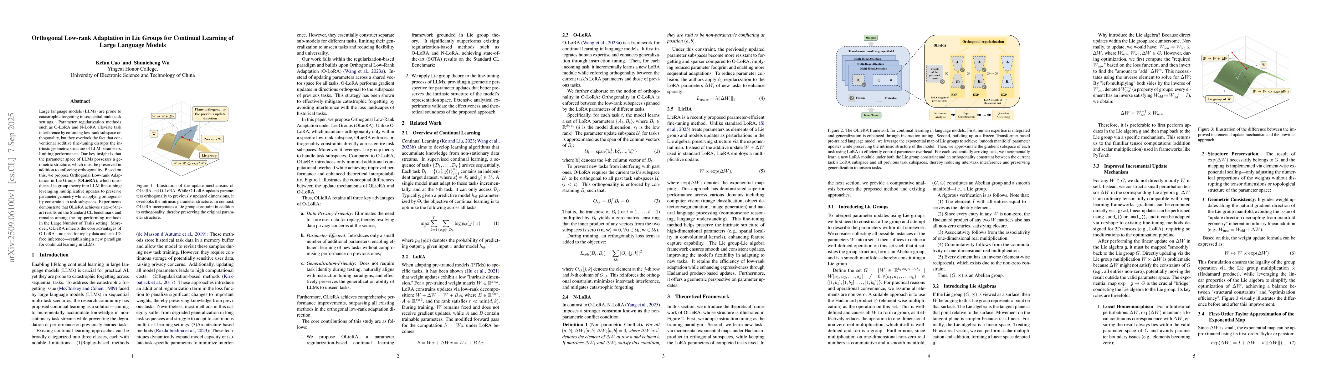 Large language models (LLMs) are prone to catastrophic forgetting in sequential multi-task settings. Parameter regularization methods such as O-LoRA and N-LoRA alleviate task interference by enforcing low-rank subspace orthogonality, but they overlook the fact that conventional additive fine-tuning disrupts the intrinsic geometric structure of LLM parameters, limiting performance. Our key insight is that the parameter space of LLMs possesses a geometric structure, which must be preserved in addition to enforcing orthogonality. Based on this, we propose Orthogonal Low-rank Adaptation in Lie Groups (OLieRA), which introduces Lie group theory into LLM fine-tuning: leveraging multiplicative updates to preserve parameter geometry while applying orthogonality constraints to task subspaces. Experiments demonstrate that OLieRA achieves state-of-the-art results on the Standard CL benchmark and remains among the top-performing methods in the Large Number of Tasks setting.