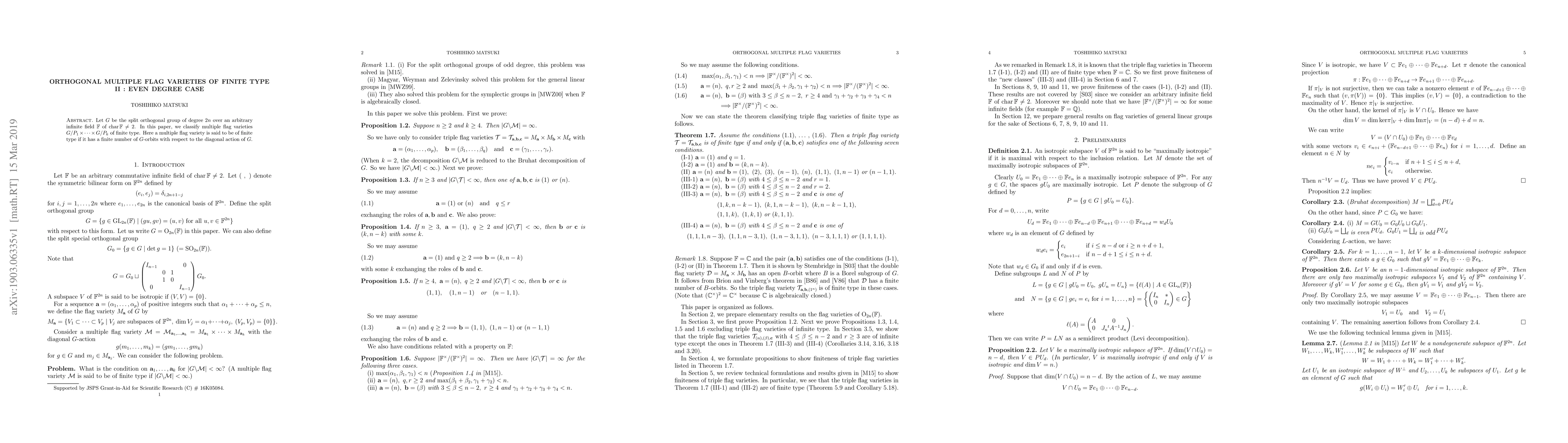 This paper classifies multiple flag varieties of finite type for the split orthogonal group of degree 2n over an infinite field with characteristic not 2. It identifies a finite number of orbits under the diagonal action of G.