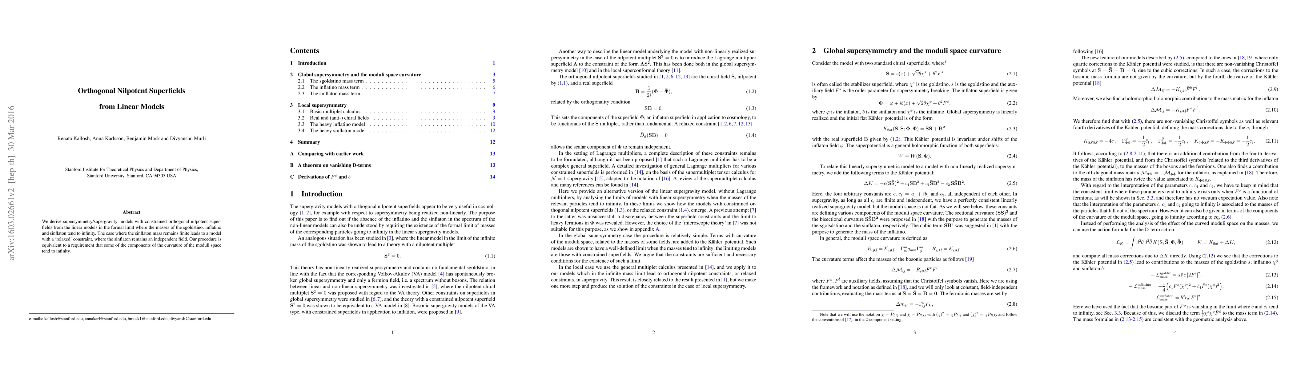 We derive supersymmetry/supergravity models with constrained orthogonal nilpotent superfields from the linear models in the formal limit where the masses of the sgoldstino, inflatino and sinflaton tend to infinity. The case where the sinflaton mass remains finite leads to a model with a `relaxed' constraint, where the sinflaton remains an independent field. Our procedure is equivalent to a requirement that some of the components of the curvature of the moduli space tend to infinity.