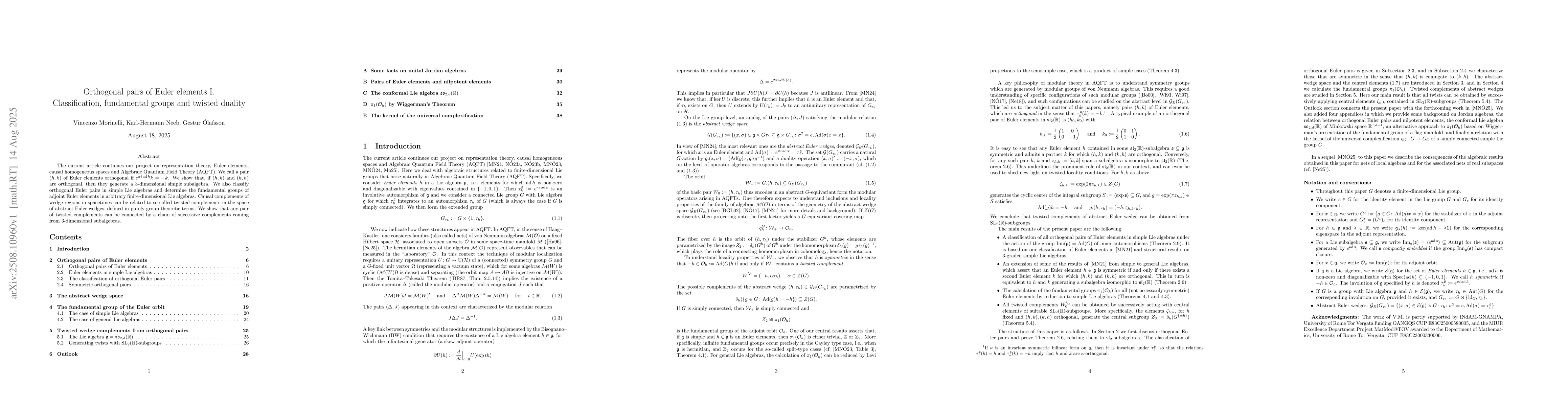 The current article continues our project on representation theory, Euler elements, causal homogeneous spaces and Algebraic Quantum Field Theory (AQFT). We call a pair (h,k) of Euler elements orthogonal if $e^{\pi i \ad h} k = -k$. We show that, if (h,k) and (k,h) are orthogonal, then they generate a 3-dimensional simple subalgebra. We also classify orthogonal Euler pairs in simple Lie algebras and determine the fundamental groups of adjoint Euler elements in arbitrary finite-dimensional Lie algebras. Causal complements of wedge regions in spacetimes can be related to so-called twisted complements in the space of abstract Euler wedges, defined in purely group theoretic terms. We show that any pair of twisted complements can be connected by a chain of successive complements coming from $3$-dimensional subalgebras.