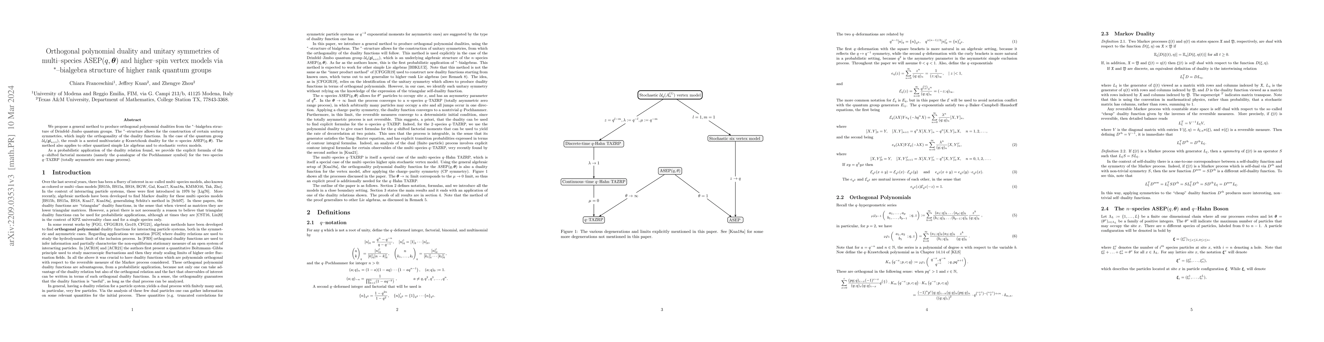 This paper introduces a method to derive orthogonal polynomial dualities using the $^*$-bialgebra structure of quantum groups, revealing unitary symmetries that ensure the orthogonality of duality functions. It applies this method to $n$-species ASEP$(q,\boldsymbol{\theta})$ and stochastic vertex models, providing explicit $q$-shifted factorial moments for the two-species $q$-TAZRP.